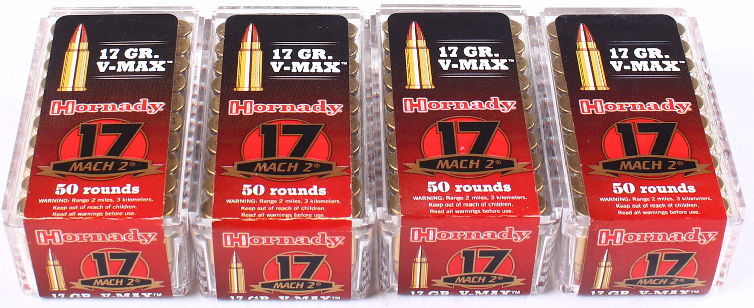 Lot of (4) Hornady,, MACH 2, 17 Grain V-Max, FULL & SEALED, 50 rds each or 200 total rounds. 1pc. Multi-colored boxes, boxes are solid with excellent color, Ammo is excellent. Grade: Excellent ++ - Value: 20 to 50