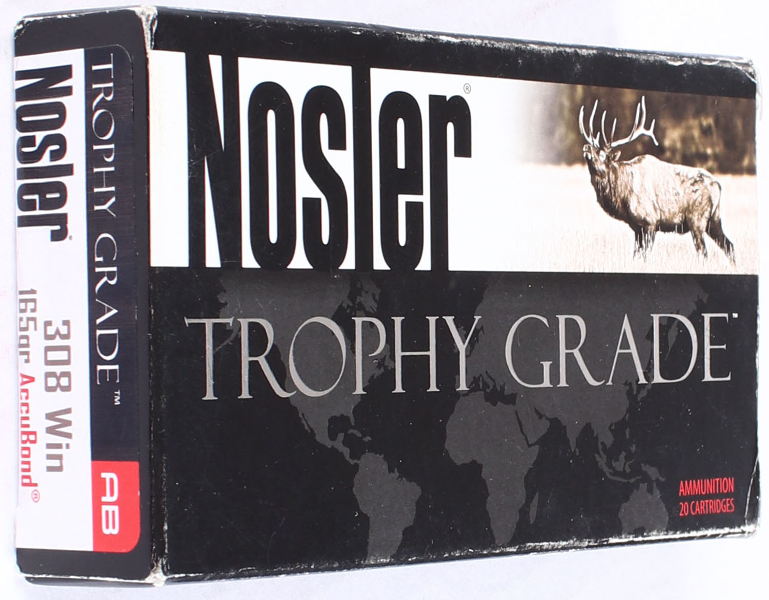Nosler, Trophy Grade, .308 Win., 165 Grain AB, Full, 1pc. Multi-colored box, box is solid with light corner wear, ammo is excellent. Grade: Excellent - Value: 20 to 60