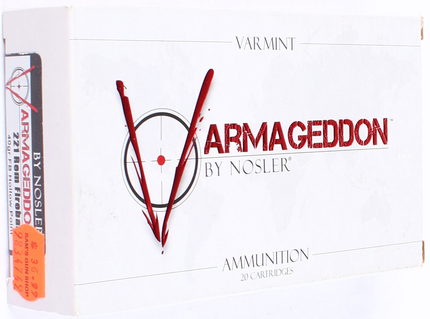 Nosler, Armageddon, .221 Remington Fireball, 40 Grain FB HP, Full, 1pc. multi-colored box, box is solid, Ammo is excellent. Grade: MINT - Value: 20 to 40
