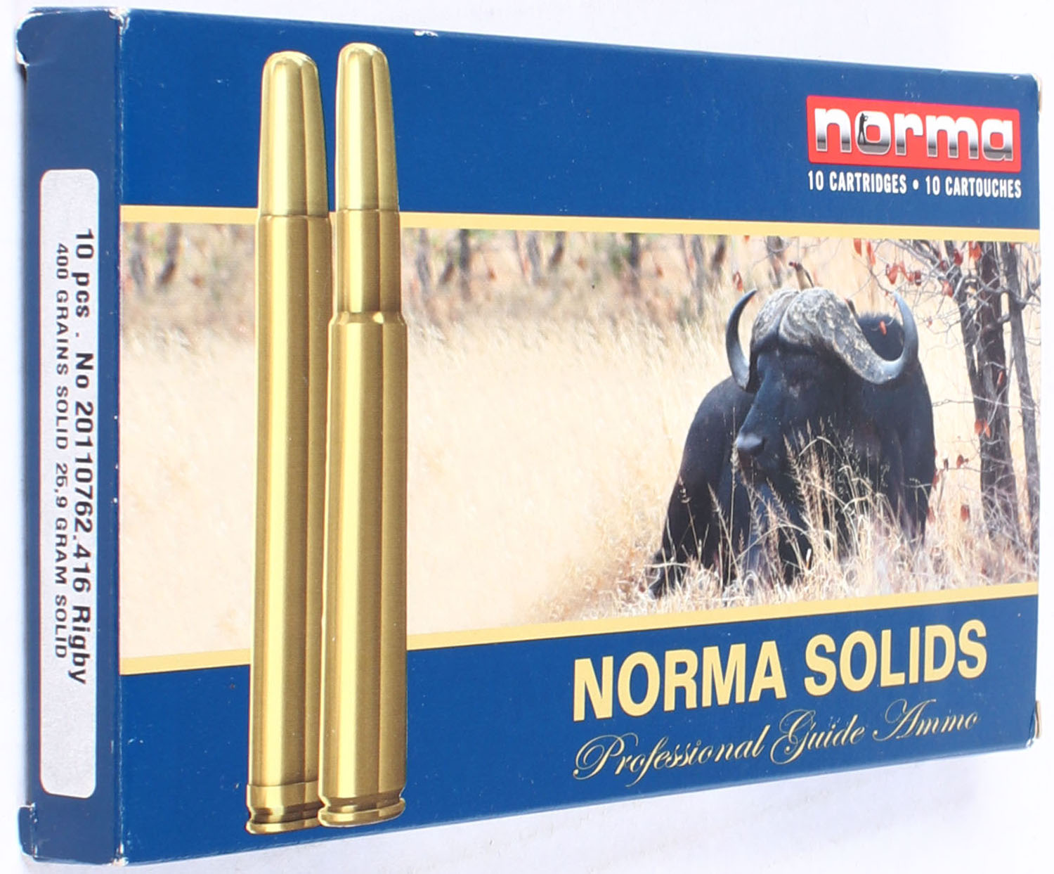 Norma, Solids, .416 Rigby, 400 Grain, Full, 1pc. Multi-colored box, box is very solid with excellent color, ammo is mint. Grade: MINT - Value: 40 to 100