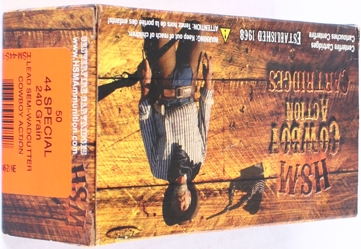 HSM, Cowboy Action Loads .44 Special, 240 Grain Lead Semi-Wadcutter Cowboy Action, Full, 1pc., multi-colored box, box is solid with excellent color, Ammo is excellent. Grade: Excellent ++ - Value: 30 to 45