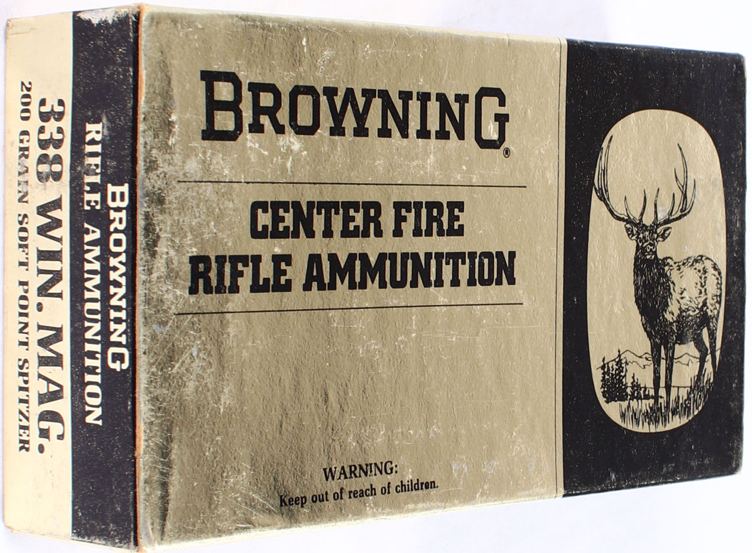 Browning, .338 Win Mag., 200 Grain Soft Point Spitzer, Full, 1pc. multi-colored box, box is solid, light shelf wear, Ammo is excellent. Grade: Excellent - Value: 80 to 120