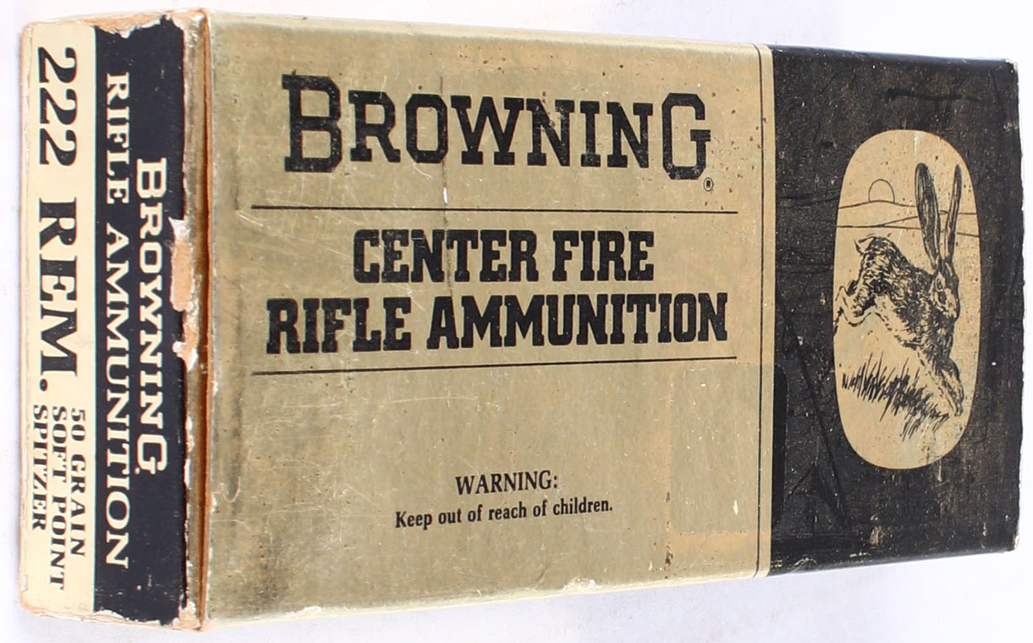 Browning, 222 Rem., 50 Grain Soft Point Spitzer, Full with Insert, 1pc., multi-colored box, box is solid with shelf wear, Ammo is very good. Grade: Very Good + - Value: 20 to 40