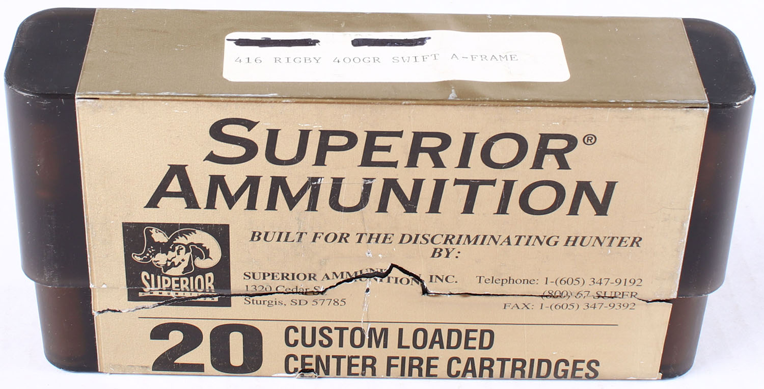 Superior Ammunition, 416 Rigby, 400 Grain Swift A-Frame, FULL & HALF SEALED, 2pc., black plastic box with gold wraparound label, box is very solid with excellent color. Grade: Excellent - Value: 40 to 100