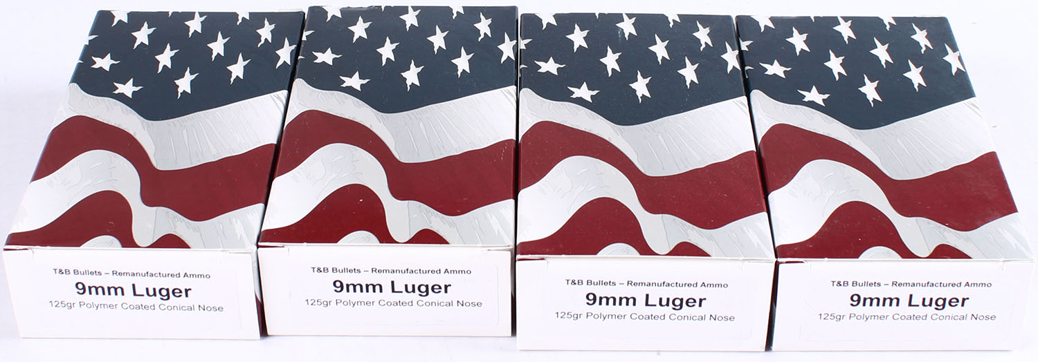 T&B Bullets, Lot of (4), .9mm Luger ammo boxes, Remanufactured Ammo by a class type 7 Ammo MFG (this is the same class (high quality) as Winchester, Federal and or CCI), 125 Grain Polymer Coated Conical Nose bullet, loaded cartridges, 1pc, Full 50 count boxes, white boxes with American flag, boxes are very solid, ammo is minty. Grade: Excellent ++ - Value: 20 to 100
