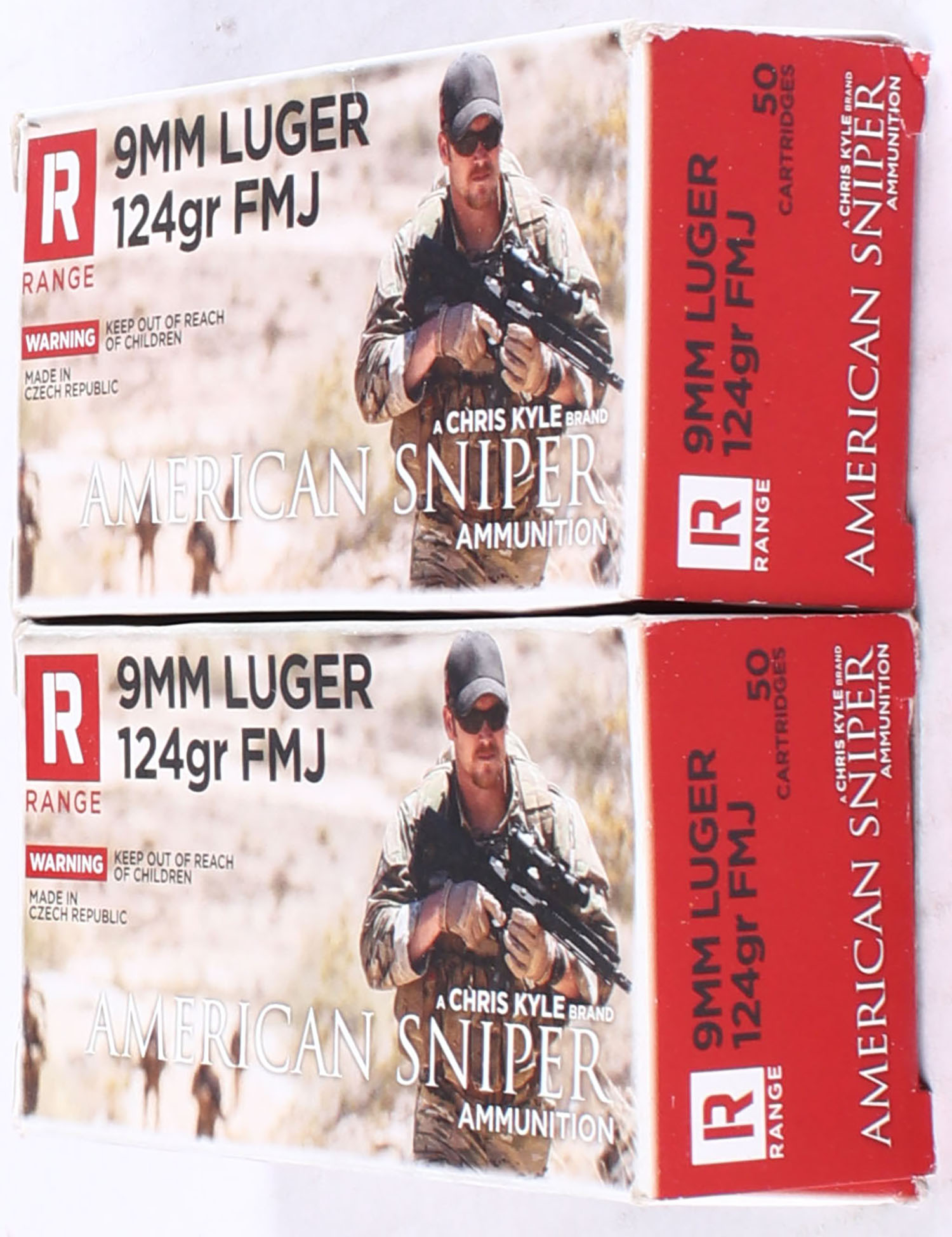 Lot of 2 American Sniper, A Chris Kyle Brand, 9mm., 1pc., Appears Full, 8g/124gr FMJ, multi-colored boxes. Grade: MINT - Value: 20 to 40