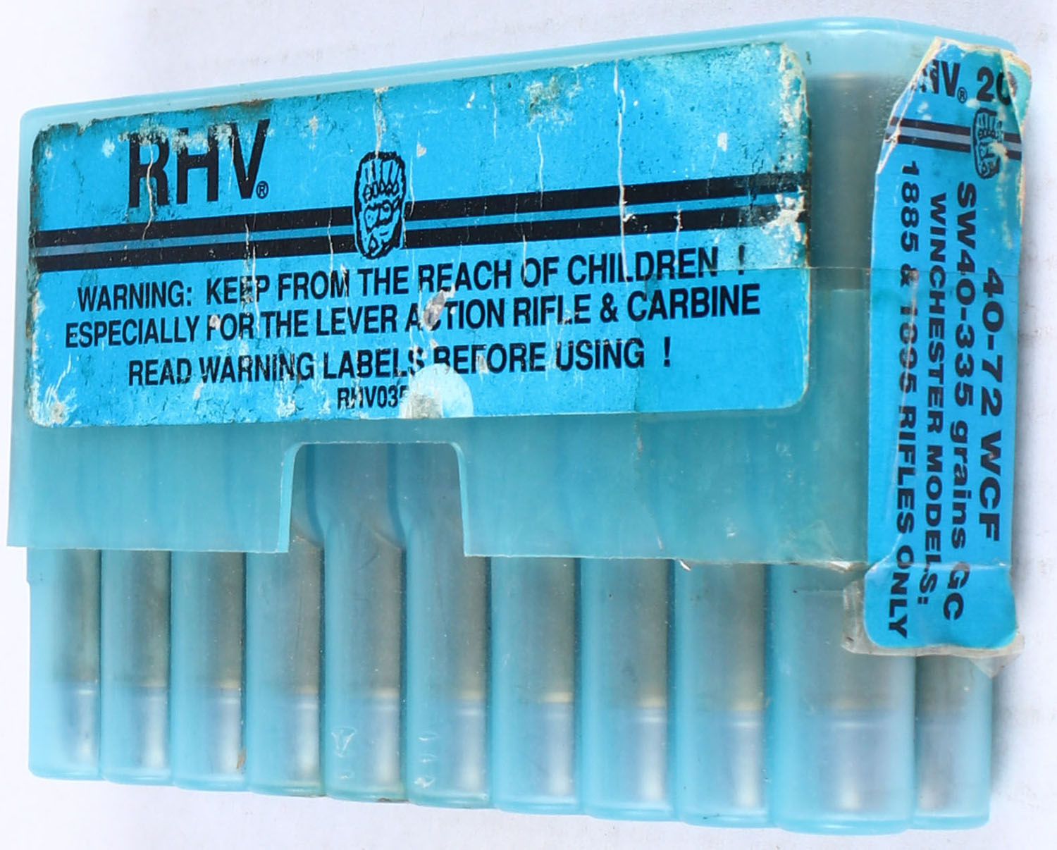RHV, 40-72 WCF SW 40-335 grains GC, Winchester models: 1885 & 1895 Rifles only, blue plastic container, with blue and black labels, full. Grade: Very Good + - Value: 10 to 40