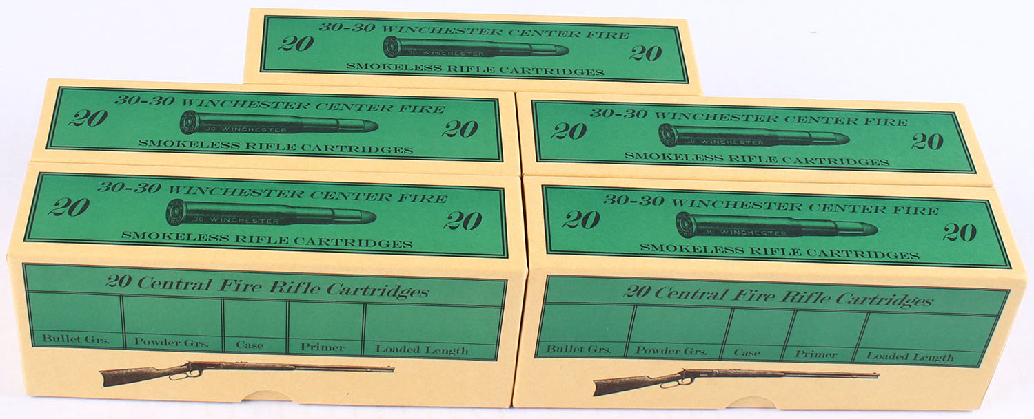 Lot of 5, 30-30 Winchester Center Fire, Smokeless Rifle Cartridges, Empty, 2pc boxes, tan/yellow box with green and black label. Grade: Excellent ++ - Value: 20 to 80