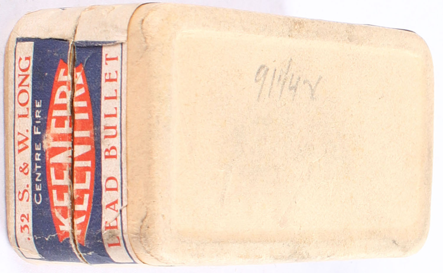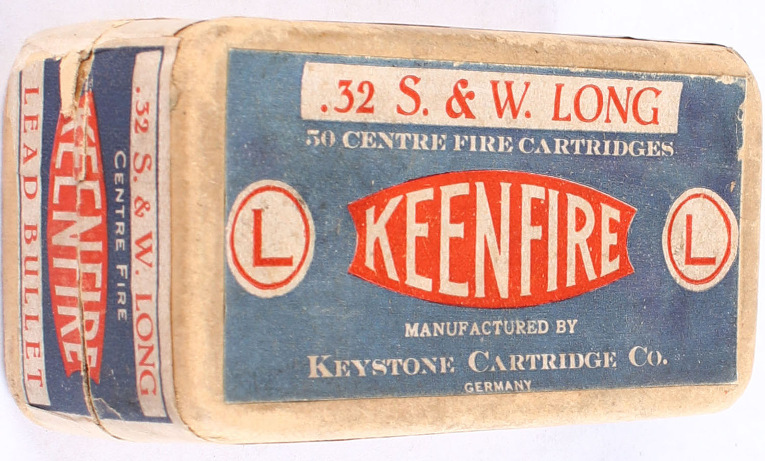 Keystone Cartridge Co., Keenfire, .32 S. & W. Long, Lead bullet, 7 rounds, 2pc. Buff box with blue, red & white print, box is solid with very good color, very minor edge wear, labels are intact, ammo is very good. Grade: Very Good ++ - Value: 20 to 150