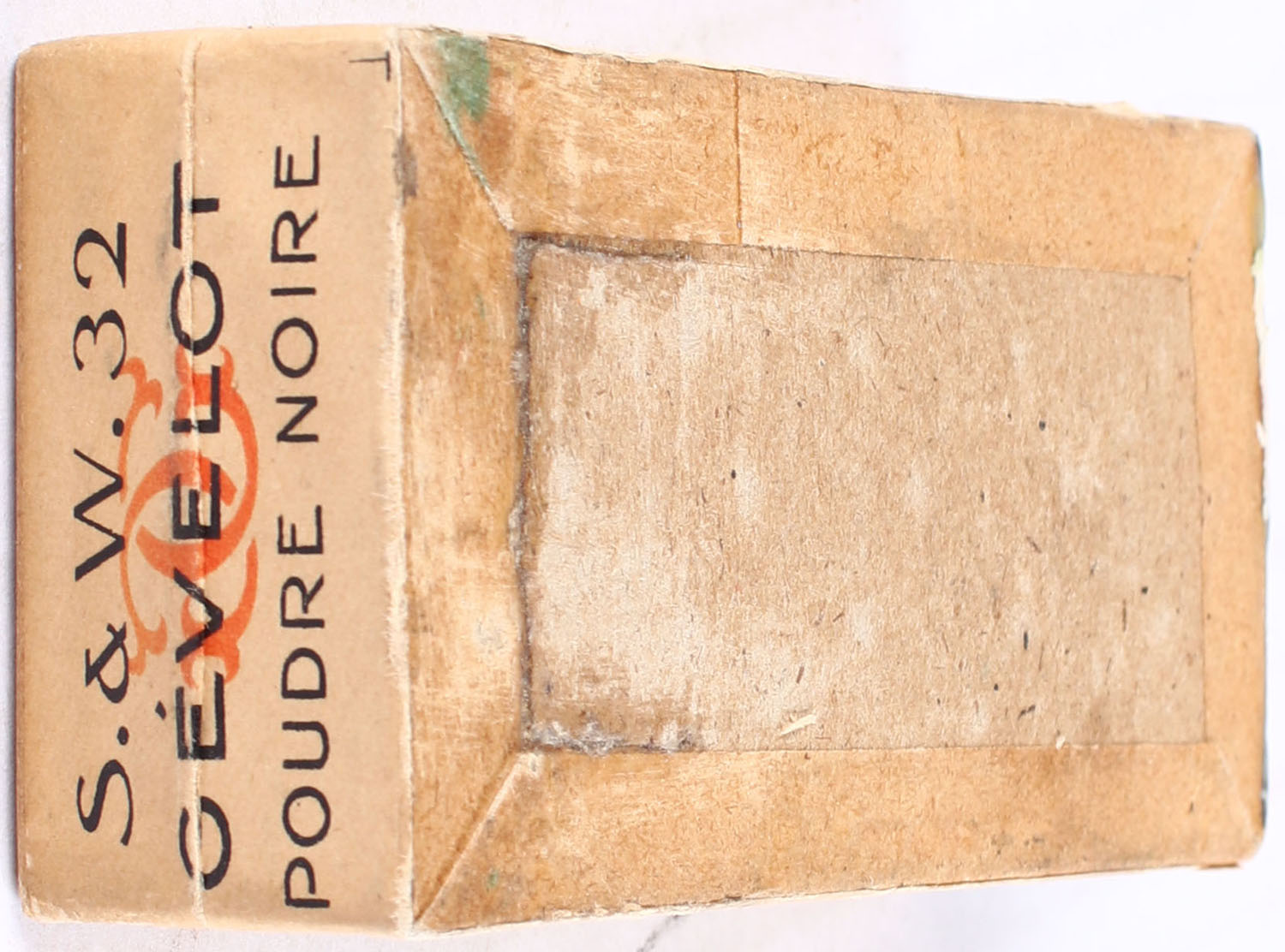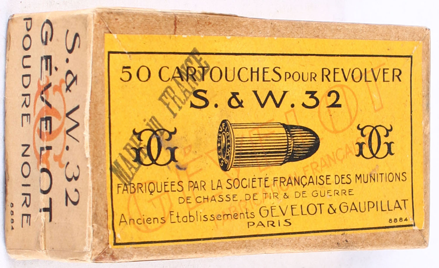 Gevelot, .32 Smith & Wesson, FULL & SEALED, buff box with yellow & black label, box has shelf wear, box is solid with overstamp ''Made in France''. Grade: Excellent - Value: 50 to 200