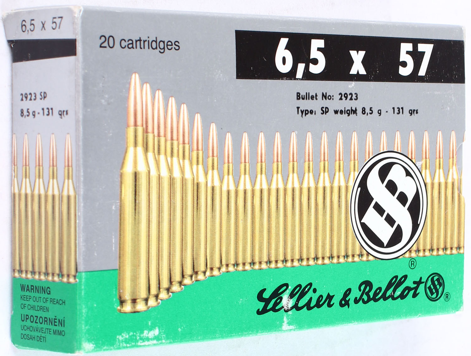 Sellier & Bellot, 6.5 x 57, 131 Grain Bullet, Full, 1pc. Silver & green box, box is solid with very good color, end flaps are solid, ammo is excellent. Grade: Excellent - Value: 14 to 21
