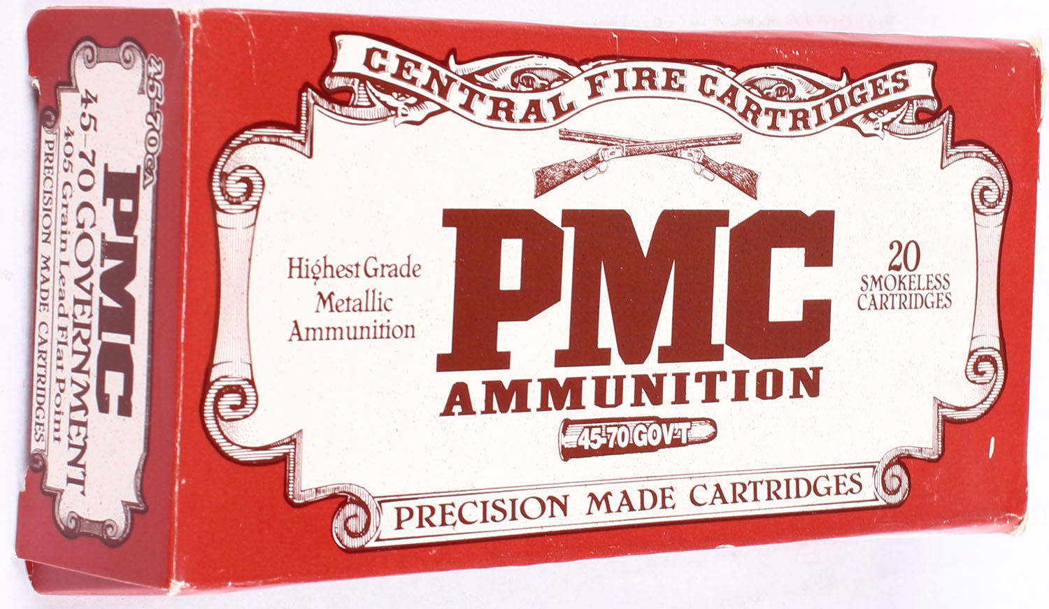 PMC, .45-70 Government, 405 Grain Leaf FP, Full, 1pc., Multi-colored box, box is very solid with very minor corner wear, ammo is very good. Grade: Excellent - Value: 30 to 45