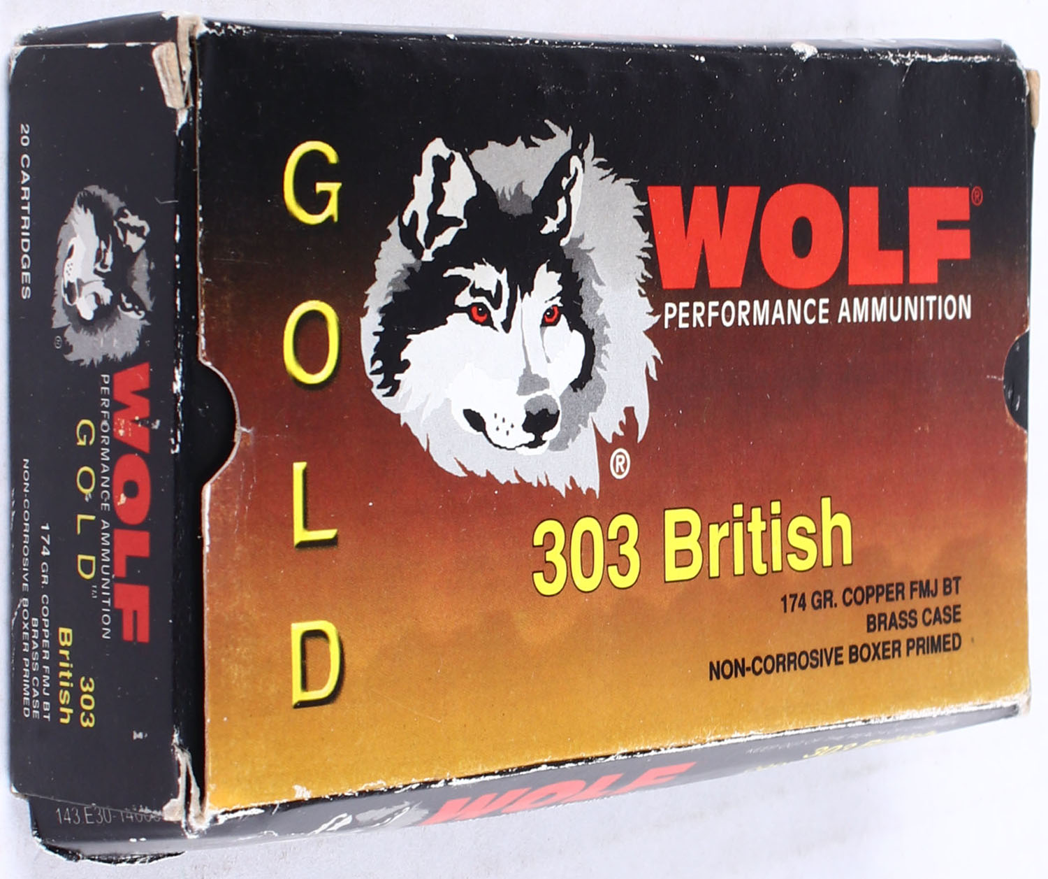 Wolf, .303 British, 174 Grain Copper SP, Brass Case, Full of wrong ammo H/S: ''PPU 303 BRIT'', 1pc, multi-colored box, box is very solid, ammo is excellent. Grade: Very Good - Value: 16 to 24