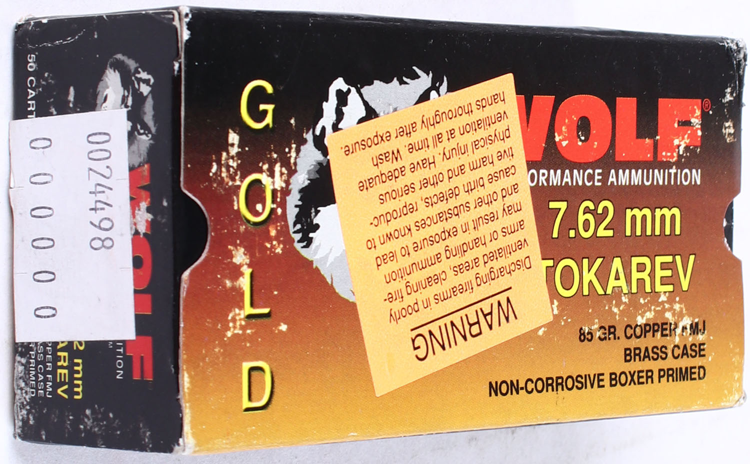 Wolf, 7.62mm Tokarev, 85 Grain Copper FMJ, Brass Case, Full, 1pc, multi-colored box, box is very solid, ammo is excellent. Grade: Excellent - Value: 16 to 24
