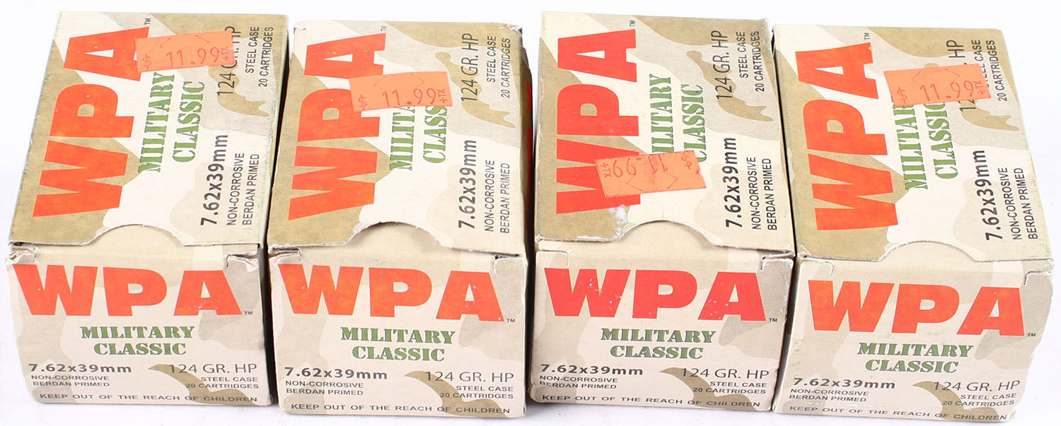 WPA, Lot of (4), Military Classic, 7.62x39 mm, 124 Grain Hollow Point, Steel Case, Full, boxes are excellent, ammo is minty. Grade: Excellent - Value: 20 to 40