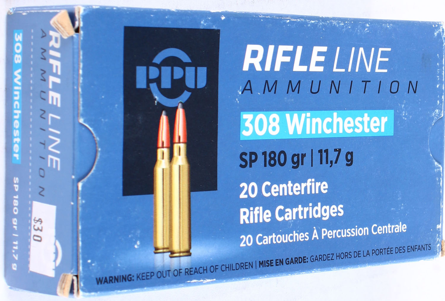 PPU, Rifle Line, .308 Winchester, 180 Grain SP, Full, 1pc, multi-colored box, box is solid with light scuffing & corner wear, ammo is minty. Grade: Very Good - Value: 14 to 21