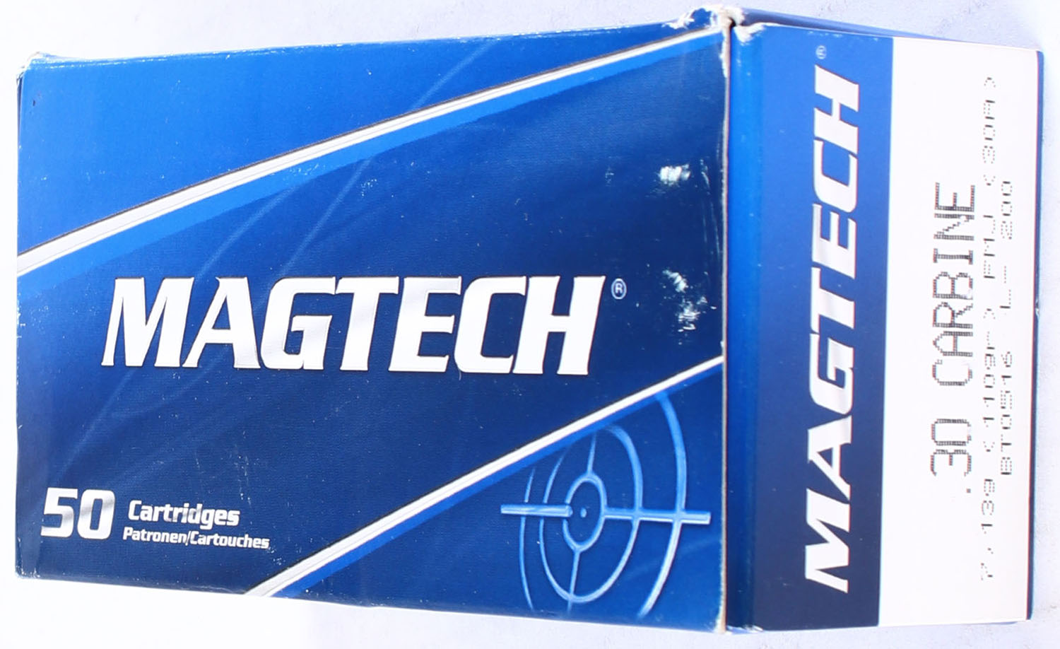 Magtech, .30 Carbine, 110 Grain FMJ, Full, 1pc., Multi-colored box, box is solid, ammo is excellent. Grade: Excellent - Value: 30 to 50