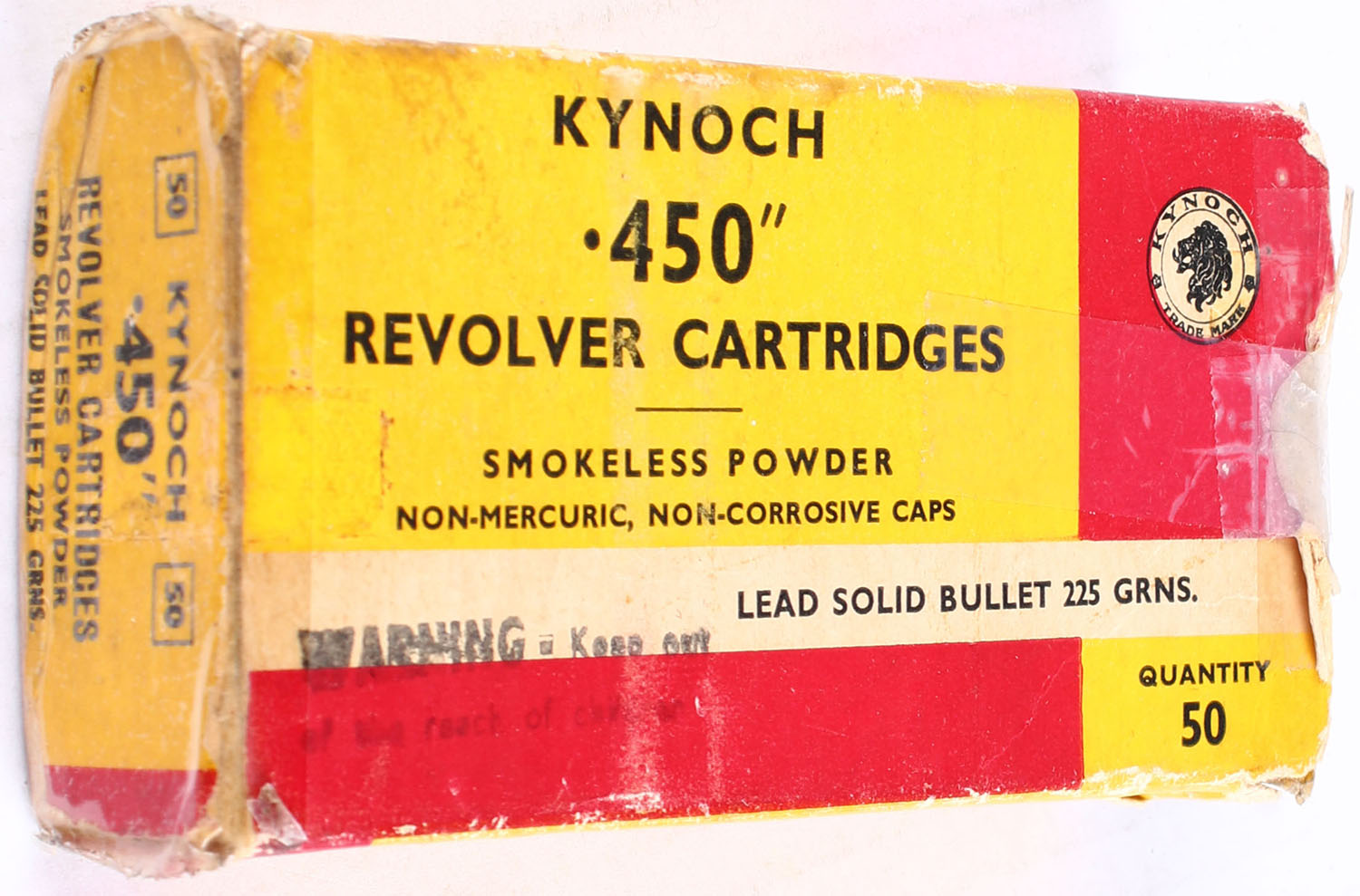 Kynoch, .450'' Revolver Cartridges, 225 Grain Lead, Partial 42rds., 1pc., Yellow & red box, box has tape repairs to end flaps, has edge & corner wear, ammo is excellent. Grade: Good ++ - Value: 20 to 50
