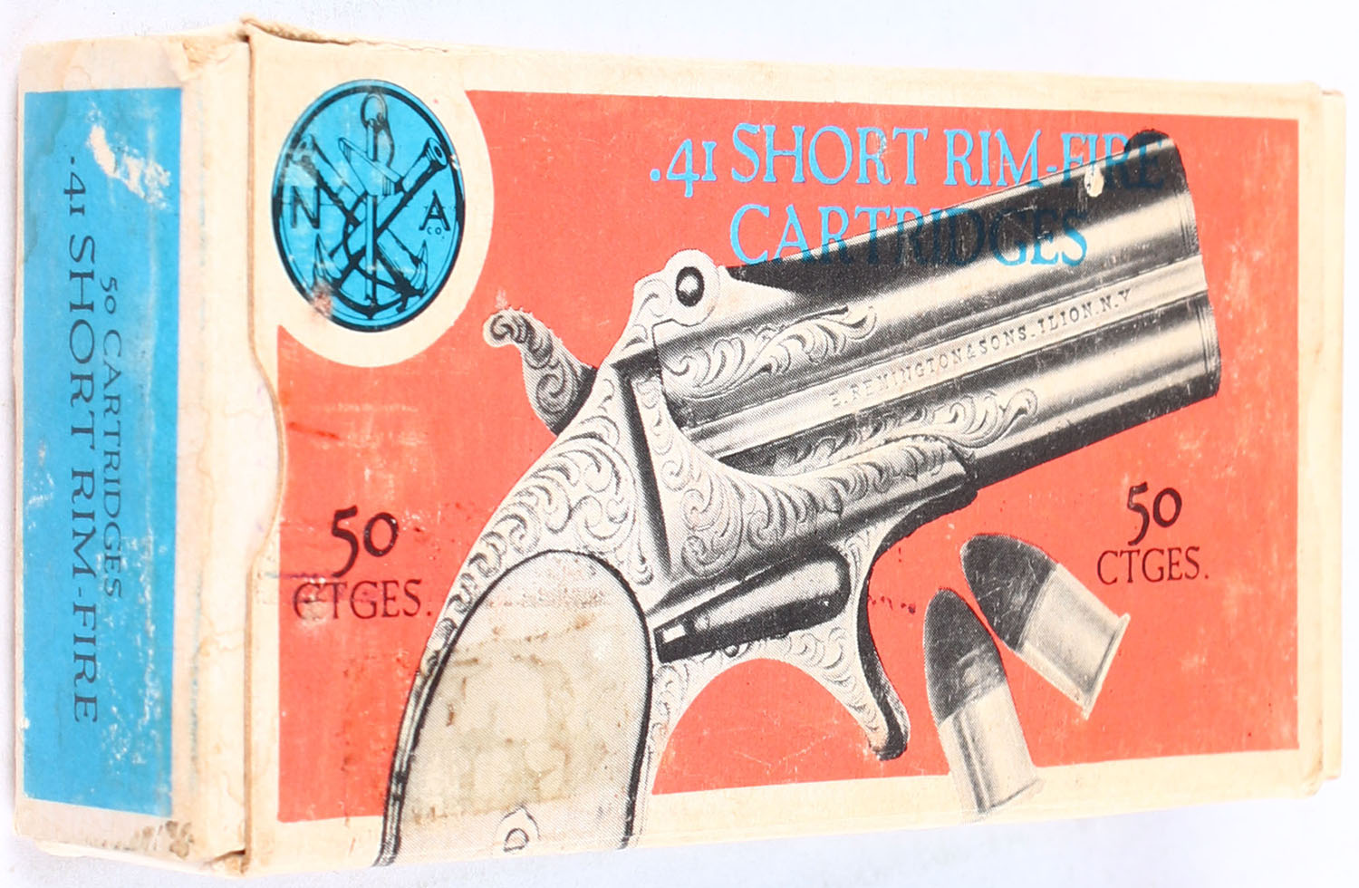 Navy Arms Co., .41 Short R.F., Full, 1pc. Multi-colored box, box is solid, with excellent color, has light age soiling, Ammo is excellent. Grade: Excellent - Value: 100 to 250