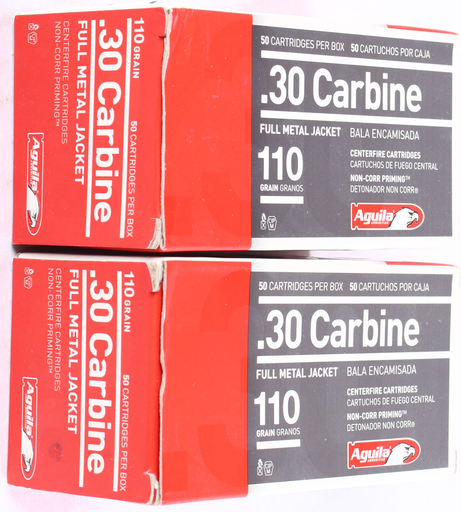 Aguila, Lot of (2), .30 Carbine, 110 Grain FMJ, Full, 1pc, multi-colored boxes, boxes are very solid with excellent color, ammo is excellent. Grade: Excellent ++ - Value: 30 to 80