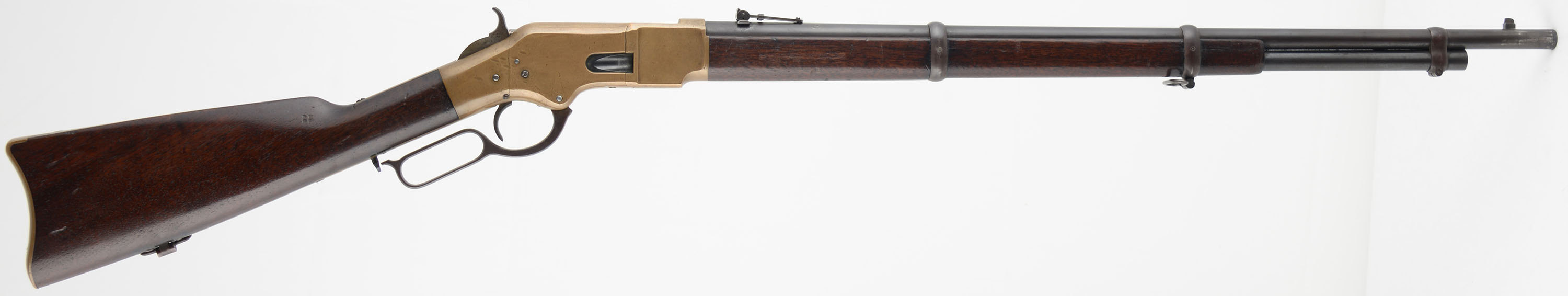 RARE Winchester, Model 1866 Musket, Third Variation 1866, First Musket Variation, CAL: 44 Henry RF, MFG: 1871, SN: 81917, Lever Action Rifle, Distinctive 27'' barrel, 24'' magazine tub. 17'' extended forearm. Model 1866 was produced in three forms for the mass market, carbine, rifle, & the musket. Muskets were not produced until the production was into the third variation of the 1866. The musket made up only 15,000 of the 170101 guns produced, less than 9% of total production, thereby making it by far the scarcest. These were made specifically for military & militia contracts, featuring the longer barrel, which was the doctrine of the time, as well as a higher magazine capacity of 17 rounds of .44 Henry. This example is one of the early production muskets. Because most 1866 muskets saw heavy use by the military in frontier battles out west, most did not survive & those that have are typically in well used & rough condition. The original straight grip wood stock & musket length forearm are excellent. There is a thin sliver of wood missing at the lower left corner of the wood, along with several minor contusions, scrapes & scratches to the original finish, which also may have an added thin protective layer or added oils. The metal finish on barrel, mag & other components has great coverage of a lovely & even dark chocolate brown patina. The loading gate retains the large majority of its original blued finish. The brass receiver has an excellent aged mustard patina. Bore is vey good, with some thin roughness amongst strong rifling. The barrel address is very good. The serial number is stamped on the lower receiver tang behind the trigger. The barrel holds the early musket pattern rear ladder sight & an iron block front sight which serves as a mount for a socket bayonet. Both original sling swivels are in place as well. Buttstock carries a brass sliding trapdoor carbine style buttplate. This is an excellent & original example of a fairly rare 1866 Musket rifle. A wonderful collectible. Antique, No FFL Req. - Value: 6000 to 9000