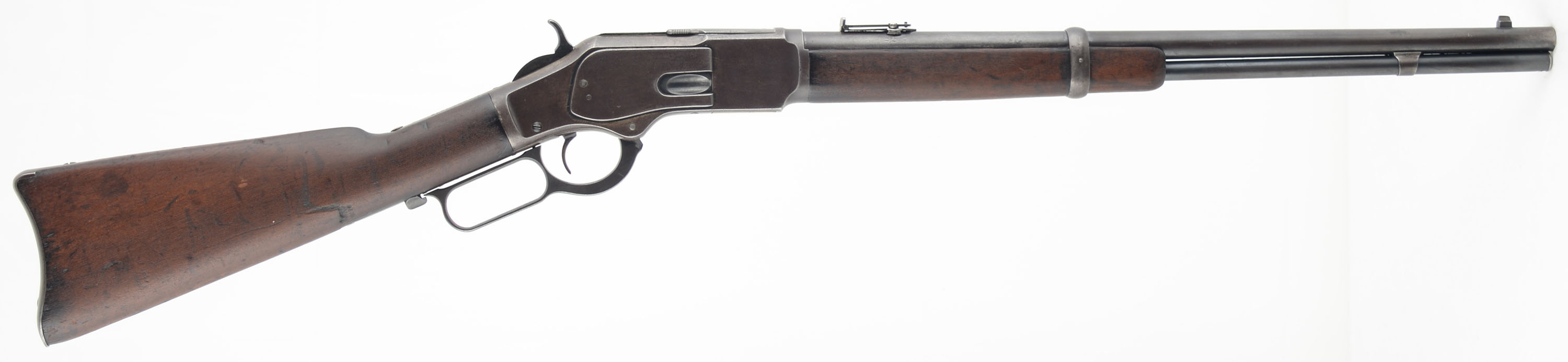 Winchester, Model 1873 Saddle Ring Carbine, 3rd model, .32 WCF Cal., MFG: 1917, SN: 718410B, Lever Action Carbine, 20'' Round barrel, Full mag. The original wood stocks are very good & solid. The wood has a nice aged or darkened rich chocolate brown appearance, with several minor to small scratches, gouges & contusions to the wood & original finish. The original metal blue finish has worn & toned to an even thinning brown patina, with remnants of original blue on the protected areas between barrel & mag. Fitted with a flip-up ladder rear & box carbine front sights. Bore is good, with some cleaned roughness amongst strong rifling. Metal carbine buttplate. Original saddle ring. Tight smooth action. A very nice, original & desirable Model 1873 SRC in the rarer 32 WCF. FFL or C&R Req. - Value: 3000 to 4500