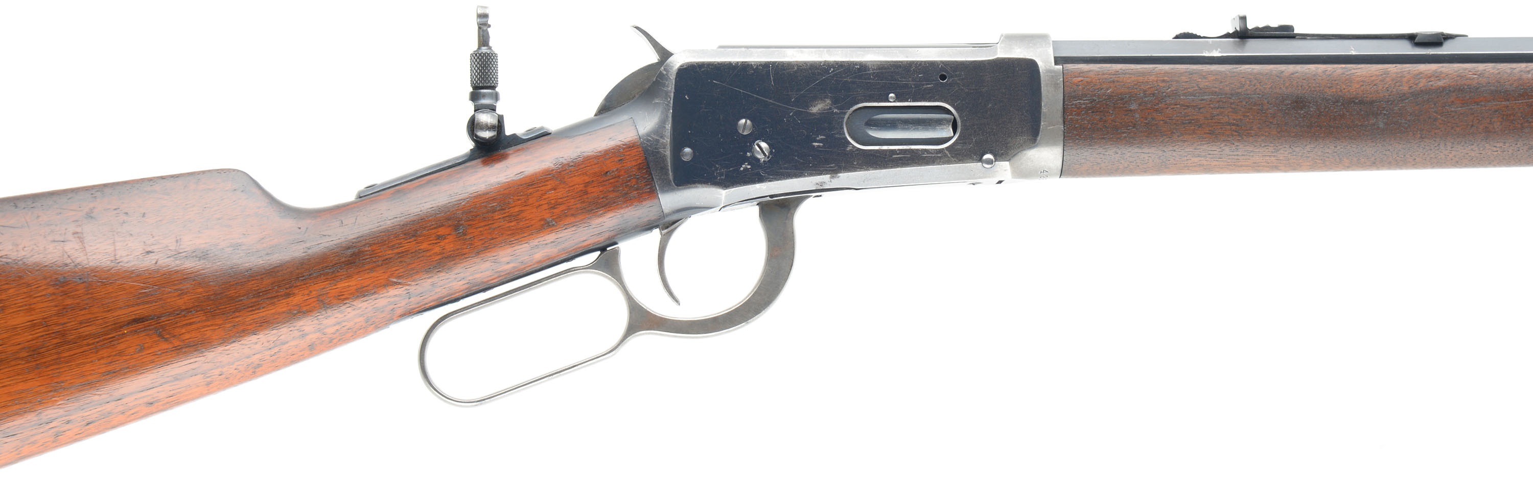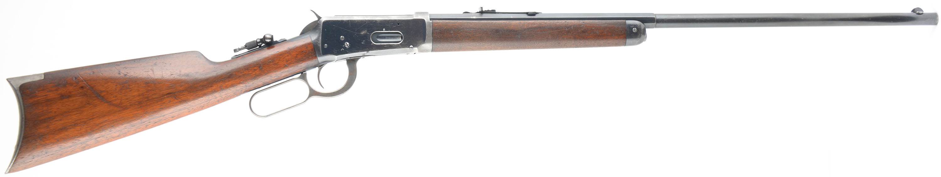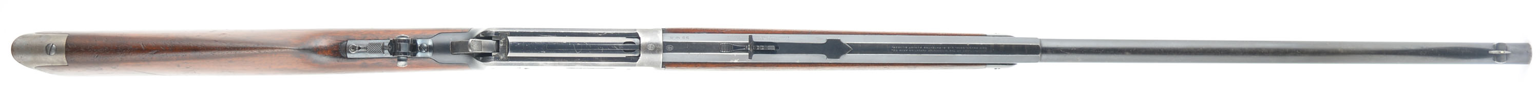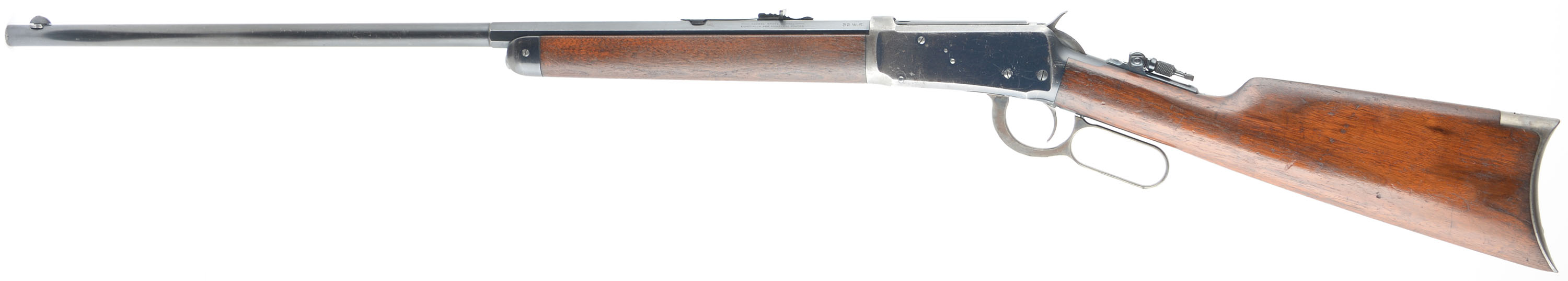 Winchester, Model 1894, .32 WS Cal., MFG: 1908, SN: 425597, Lever Action Rifle, 26'' !/2 Octagon, 1/2 Round Nickel Steel barrel, Button mag., The original straight grip wood stocks are excellent, with several minor to small handling marks, scratches, & contusions to the original finish, which is showing some use thinning. There are a couple of tight & short hairline stress cracks emanating from the end of the upper tang. The original metal blue finish rates 80% on barrel & 60% on receiver. The case-hardened lever & hammer still display remnants of case-colors. The rifle is fitted with a upgraded sight package including a Lyman flip-up tang sight, an adjustable rear sight & a Lyman half moon blade front sight, with ivory bead. Stock carries the original crescent metal buttplate. Bore is excellent & bright. A nicely configured & collectible overall condition rifle. FFL or C&R Req. - Value: 2500 to 3500