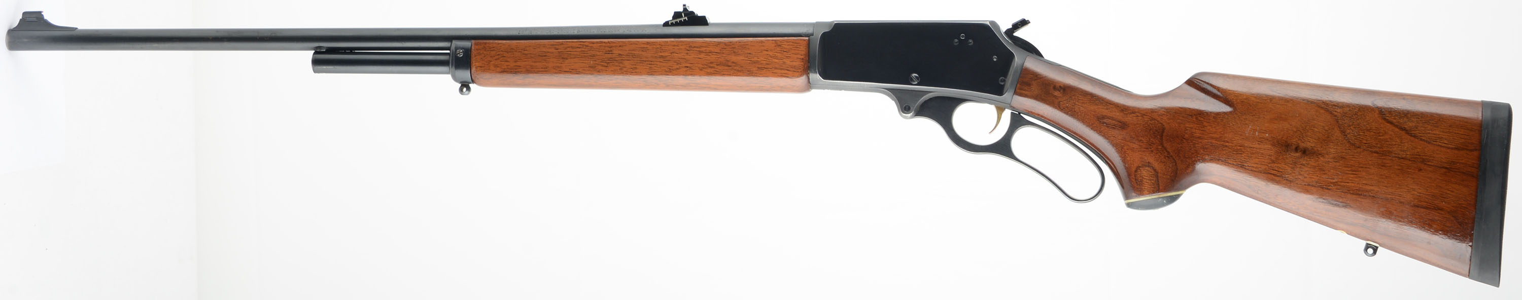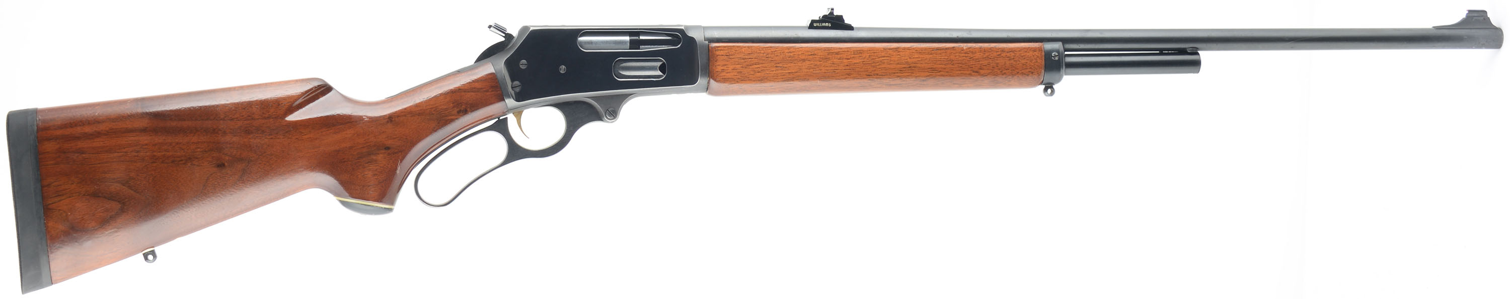 Marlin, Model 336 A, CAL: 30-30 WIN, MFG: 1975, SN: 25023580, Lever Action Rifle, 23 3/4'' barrel, 2/3rds mag. The original whiteline capped pistol grip wood stocks are excellent, as previously lightly sanded & refinished. There are very few minor handling marks remaining to the high gloss refinish. The metal blue finish rates 90% overall. Bore is excellent, & bright. The barrel carries a Williams slide adjusting rear & ramp elevated blade front sights. Receiver is factory tapped & drilled for potential scope mounts. Stock carries an Old English solid recoil pad. Factory trademark bullseye in belly of the stock. Sling studs. Added hammer extender. Gold tone trigger. A very nice presenting lever action hunting rifle. FFL or C&R Req. - Value: 500 to 1000