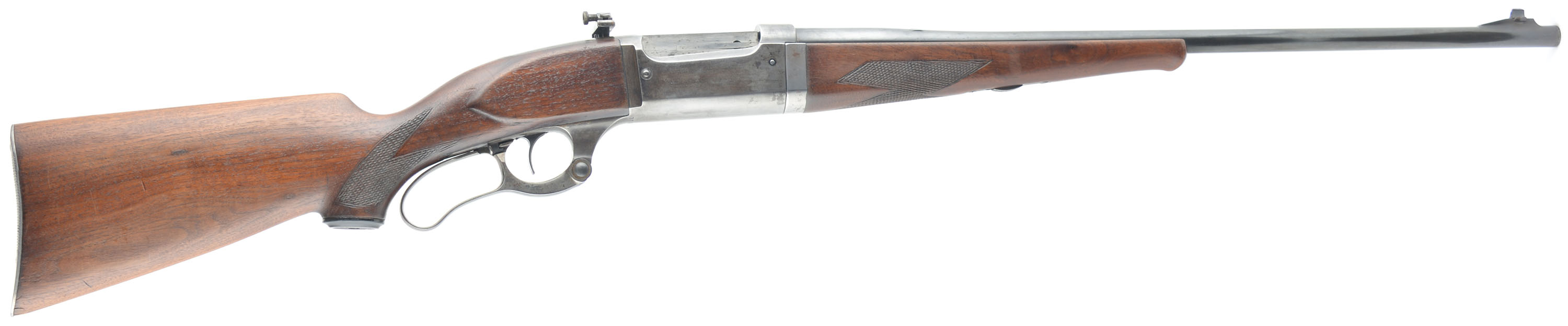 Savage, Model 99 Take-down, CAL: 250-3000 SAV, MFG: 1927, SN: 305762, Lever Action Rifle, 22 1/4'' round barrel. The original checkered & capped pistol grip wood stocks are excellent. There is a small chip & 1/2'' crack at the toe, a small gouge on the belly of the stock & other minor handling marks, scratches & contusions to the original finish. The original metal blue finish on the barrel rates 40%, while the receiver has worn mostly gun metal gray with a thin brown patina. The case-hardened lever has also worn mostly gray, but with remnants of case-colors. Bore is excellent & bright. The receiver holds a side mounted Redfield peep sight, while the barrel has a lead filled rear dovetail & ramp elevated blade front sight. The stock carries the original serrated metal buttplate. A quality vintage take-down lever. FFL or C&R Req. - Value: 600 to 1200
