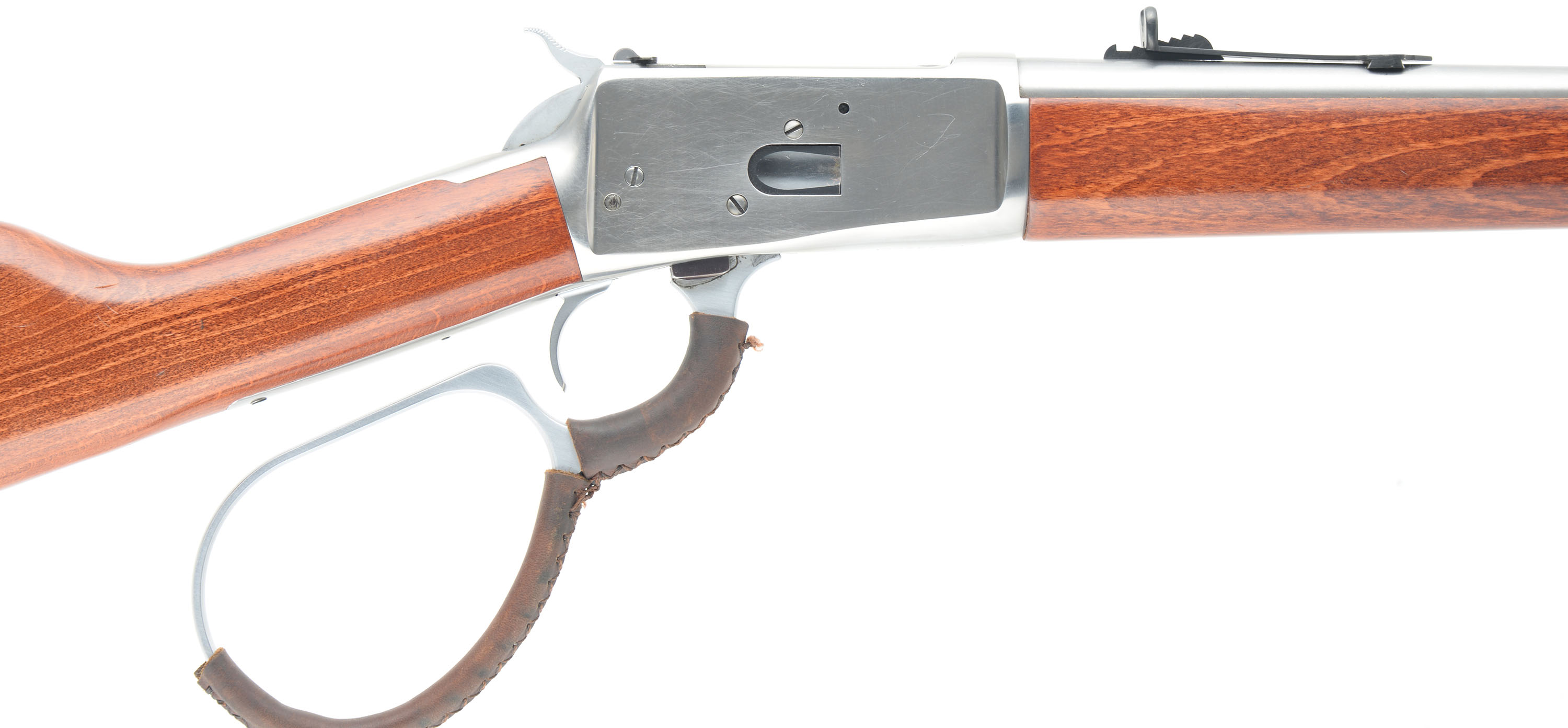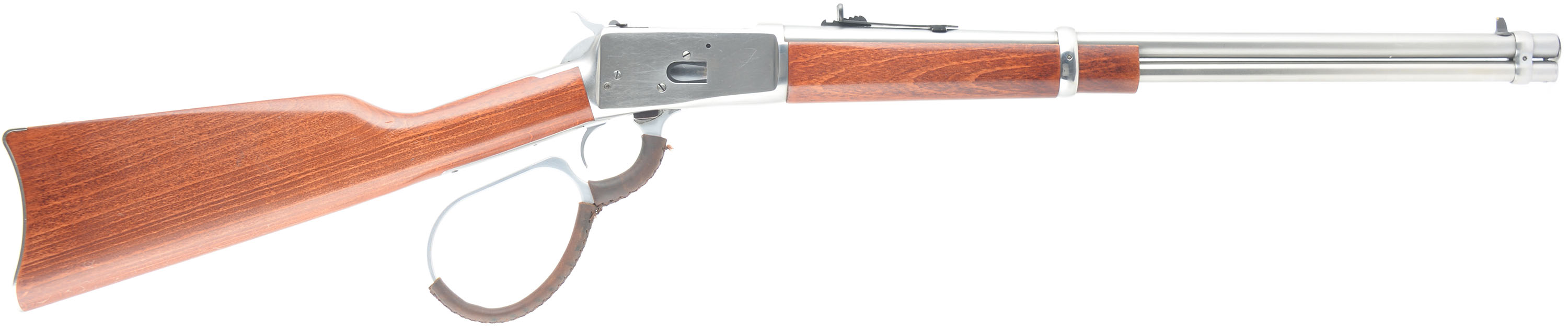 Rossi, Model R92 ''Big Loop'' Saddle Ring Carbine, CAL: 38 SPL - .357 MAG, MFG: Modern, SN: 7CR055200P, Lever Action Carbine, 20'' Stainless steel barrel. 1:24'' twist rate. Full Mag. The original straight grip stocks are excellent, with a few minor rubs & scratches to the excellent original finish. The stainless steel metal finish rates excellent overall. Bore is excellent. Barrel carries factory sights. Buttstock carries a carbine style buttplate. Leather wrapped lever & leather lash on the saddle ring. An excellent modernized version of an American classic. FFL Req. - Value: 600 to 1000