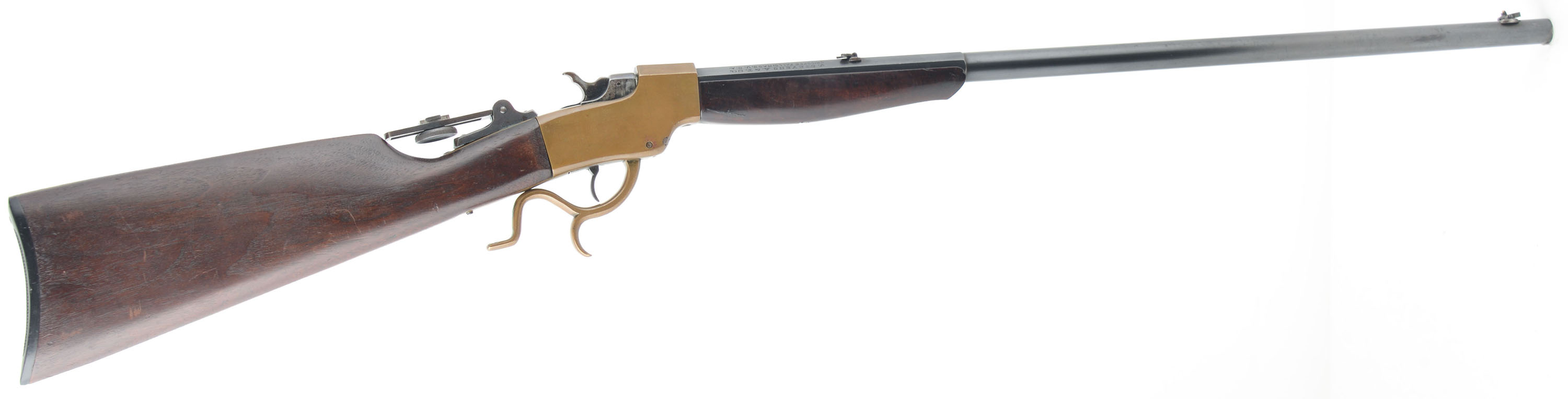 RARE J. Stevens A&T Co, Model ''Unitary'' Prototype Favorite, CAL: 25RF, MFG: Antique, SN: NVSN, Falling Block Lever Action Rifle, 23'' Octagon/round barrel. This prototype rifle was built by long time stevens employee Bill Goyette, & features a unique action that drops the entire firing group as a unit on lever action. The straight grip wood stocks are excellent & solid. They appear to carry the original finish, with a few minor scratches, contusions & scrapes. The metal blue finish on the barrel rates 95%. The brass receiver & spur lever have developed a beautiful spicy mustard brown patina. Bore is excellent & bright. The receiver is fitted with a flip-up, Stevens tang sight with Hadley eye cup. The barrel carries a single leaf fold rear sight & a ivory bead folding globe sight. The bottom flat of the barrel is stamped with the # ''14'' under the forearm, while the # 21 is stamped on the bottom of the barrel in front of the forearm. The stock carries a checkered plastic buttplate. This is a fantastic example of a unique & rare prototype & part of the history of the Stevens Favorite. Antique No FFL Req - Value: 2000 to 3000