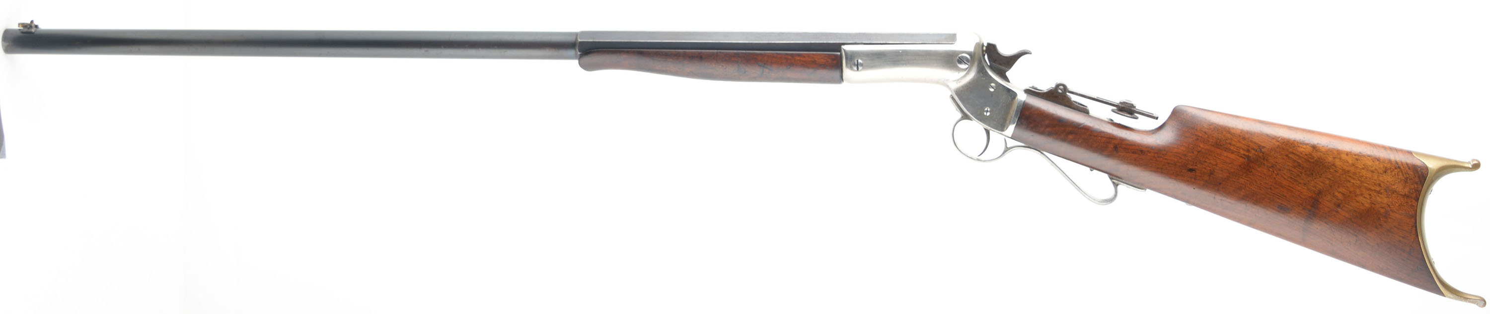 J. Stevens A. & T. Co., Model No. 9 Tip-Up New Model Range Rifle, Cal: 32-35, MFG: 1886 - early 90's, SN: 27974, Single shot, tip open, 30'' Octagon to round barrel, Stevens marketed the Model no. 9 as ''The most accurate of the Tip-up rifles''. The original straight grip wood stocks are excellent, with some light scratches, scrapes & dings to the excellent finish. There is a 2'' glue repaired corner break to the back right side of the forend. Left side of barrel is marked ''J. STEVENS A. & T. CO. CHICOPEE FALLS.MASS. S.A. PAT.SEPT.6.1864''. The metal blue finish to the barrel rates 70%, with much of the loss on the breech end due to several areas of cleaned pitting & areas of thinning toning to a brown patina. The nickel finished receiver & rates very good retaining the majority of the nickel. The receiver is fitted with a large sliding disk flip-up Vernier tang sight, while the barrel carries a folding globe front sight. Bore is very good, with roughness amongst strong rifling. Stock carries a nickeled brass Schuetzen buttplate, retaining remnants of original nickel. An excellent example of the early Stevens tip-up rifle. Antique, No FFL Req - Value: 600 to 1200