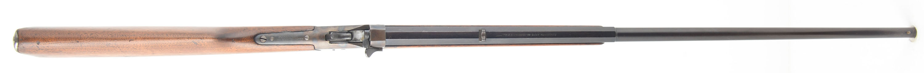 CUSTOM Remington, Model 4 Take-down SMOOTHBORE, .32 R.F., MFG 1902-24, SN: 164908, Rolling block single shot rifle. 24'' Octagon to round barrel. The model 4 was produced from 1890 to 1933 in several variation & evolutions. The model 4 began production in 1890 as a screw in fixed barrel, but it was change to a take-down with lever in 1902 until 24 when it was changed again to a take-down screw. The rifle with the take-down screw was produced from 1924 to 33. This mid production lever take-down variation was altered into a smoothbore & has an old refinish, likely done by Axel Peterson, as it is stamped ''A.W. PETERSON DENVER COLO.'' The straight grip wood stocks are very good & solid, having been lightly sanded & refinished. There remains remnants of old use marks & some oil dark spots remaining. The metal blue on the barrel is older refinish is starting to tone a bit plum, with coverage rating 80% overall. The top of the receiver has been machine flattened & there are other a couple other areas showing evidence of filing or polishing & then heat torch treated. The smooth bore is excellent. Barrel carries a fixed dovetail rear & bead front sights. The stock carries a smooth metal Remington buttplate. FFL or C&R Req. - Value: 400 to 800