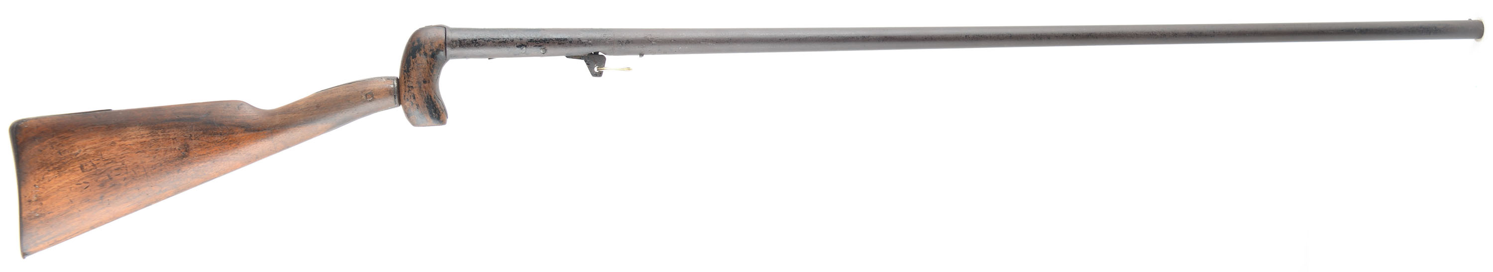 RARE J.P. Hubbard-London Day's Patent Can Gun, 50 cal, Circa 1827-35. No SN, Percussion, 28 1/4'' Barrel length. 34 3/4'' overall cane length, plus 11'' if mounted with screw on shoulder stock. The handle measuring 3 1/4'' long. The ''J.P. Hubbard-London Day's Patent Can Gun'' is a walking stick firearm, also known as a cane gun, that was popular in Britain during the first half of the 19th century. It utilized a ''Day's Patent'' ignition system, patented by John Day around 1823. This system was incorporated into various types of firearms including these types of cane gun. This example was manufactured by J.P. Hubbard, at his London address. Disguised as simple a walking canes, these were primarily marketed to urban gentleman for personal protection, but also to farmers & thus the screw on buttstock. These were muzzle-loading, percussion firearms with iron barrel, under hammer & trigger system, with curved walnut one piece grip handle. The under hammer design was likely used to keep the powder dry. The cane gun carries a medallion on the back left side of the barrel, which features an embossed coat of arms, with a lion & unicorn, & marked ''(J.)P. Hubbard 26 Newgales - Days Patent''. The trigger & hammer system extend from the barrel when the ring is pulled, engaging the tension spring. Once the trigger is pulled, the hammer drops onto a percussion cap previously affixed to the nipple. Mechanism appears to function properly, although the ring is a modern replacement. The piece shows a chocolate brown patina, with some spotty remnants of black finish on both the barrel & the walnut handle. The stock suffered a wrist break & has been glue repaired & further strengthen with screws & rivets. Stock carries the original metal buttplate. An authentic survivor of a bygone era, which is extremely rare, especially with the original accompanying stock. Antique, No FFL Req. - Value: 1000 to 2600
