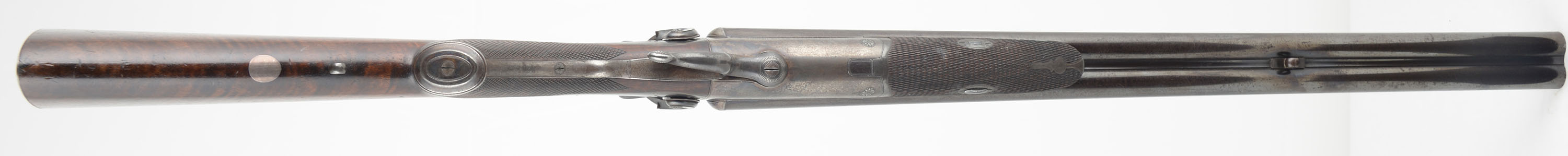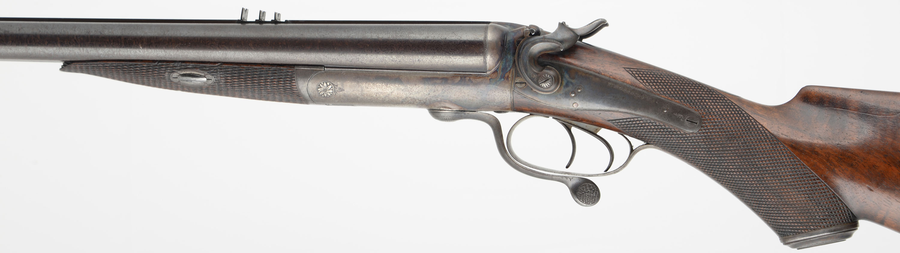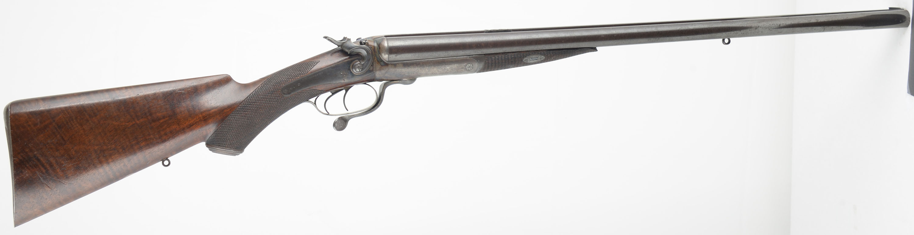 FANTASTIC W.W. GREENER, Model Hammer Double Rifle, CAL: 16 Bore, MFG: Ca. 1870 or at least the early 1870's. Antique, SN: 8717, Under Lever Break Double Hammer Rifle, 25'' Laminated Steel barrels, 10.2 lbs. While WW Greener records for the period prior to 1880 do not contain much information, but according to internet information, this 16-bore double rifle was made in 1871 & featured their patented self-retracting striker mechanism (Greener's solution to the tendency for firing pins in the early centerfire era to stick in the soft primers of cartridges of that time, effectively bolting the gun closed after discharge). Self-retracting striker shotguns & rifles were made by W.W. Greener between 1868 & 1875 & most had Jones under-lever opening mechanisms. Shotguns of this type are not common & rifles are quite rare.