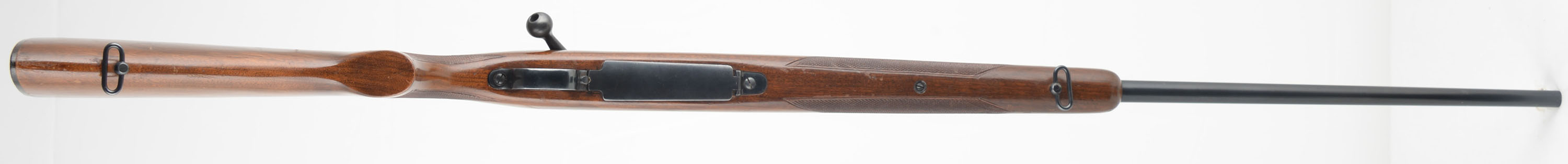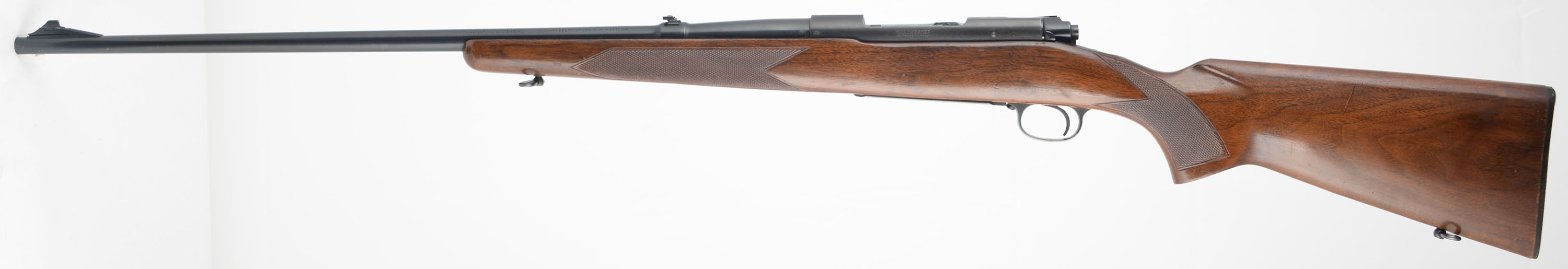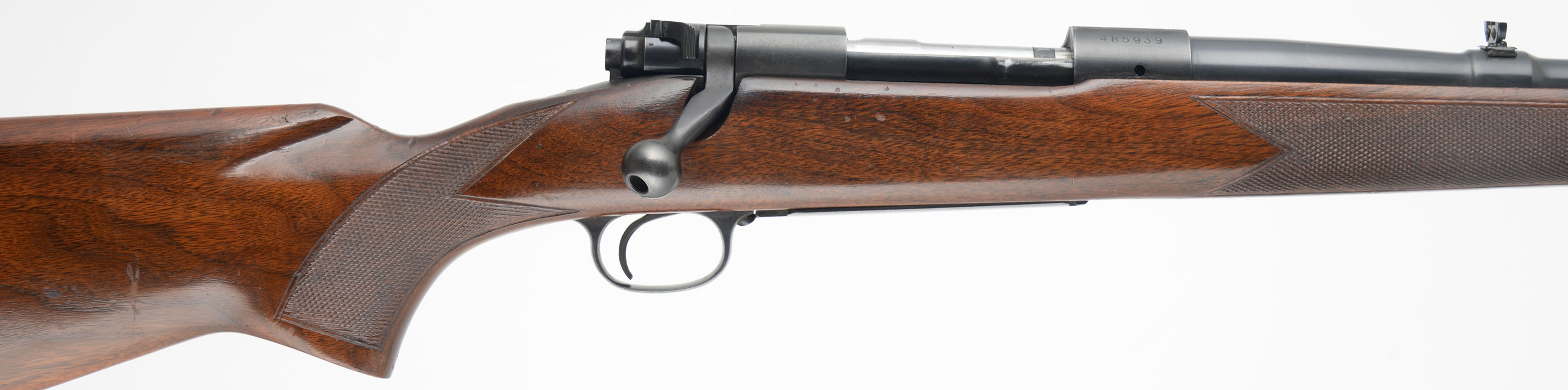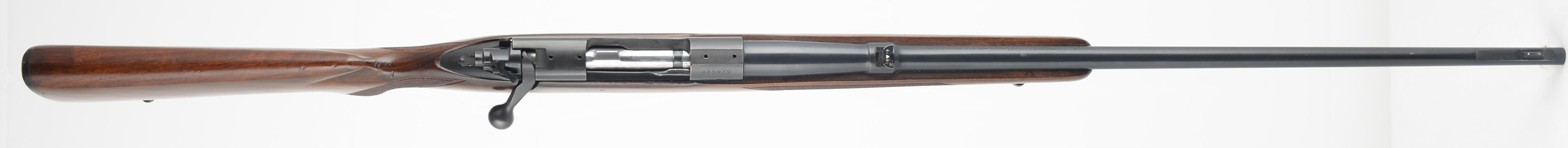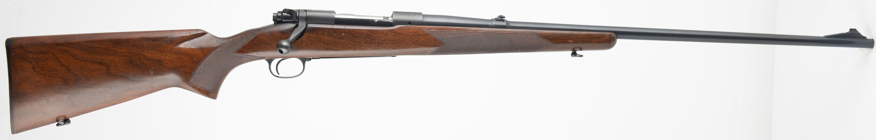 Winchester Model 70, CAL: 264 WIN MAG (Westerner), MFG: 1960, SN: 485939, Bolt Action Rifle, 26'' barrel. The original checkered flat pistol grip wood stock is excellent, displaying minor to small handling marks, rubs, scratches & contusions to the excellent factory finish. The metal blue finish rates 95% overall. Bore is excellent & bright. The receiver has open the four factory holes from previous scope mounting, while the barrel carries a flip-up rear sight & ramped front sight. Buttstock carries a checkered, black plastic buttplate. Sling swivels. An original & excellent overall example. FFL or C&R Req - Value: 1000 to 1800