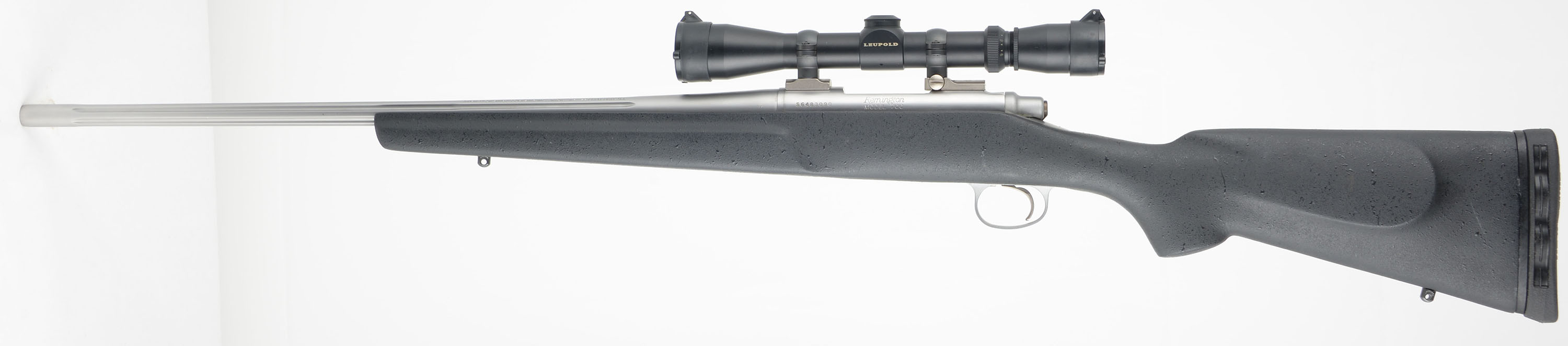 Remington, Model 700 SS Light Varmint, CAL: 221 REM Fireball, MFG: 2003, SN: 56483090, Bolt Action Rifle, 22'' Round fluted barrel, recessed crown. The original cheeked & flat pistol grip gray composite stock is excellent. The factory satin stainless steel metal finish rates excellent overall. Bore is excellent & bright. The receiver holds a Leupold Vari-X 3-9x33mm Compact scope, with flip-up caps, while the barrel has no sight provisions for open sights. Stock carries a solid recoil pad. Jeweled bolt. Internal 4rd magazine. Sling studs. A fantastic all weather varmint rifle. FFL Req. - Value: 1000 to 1500