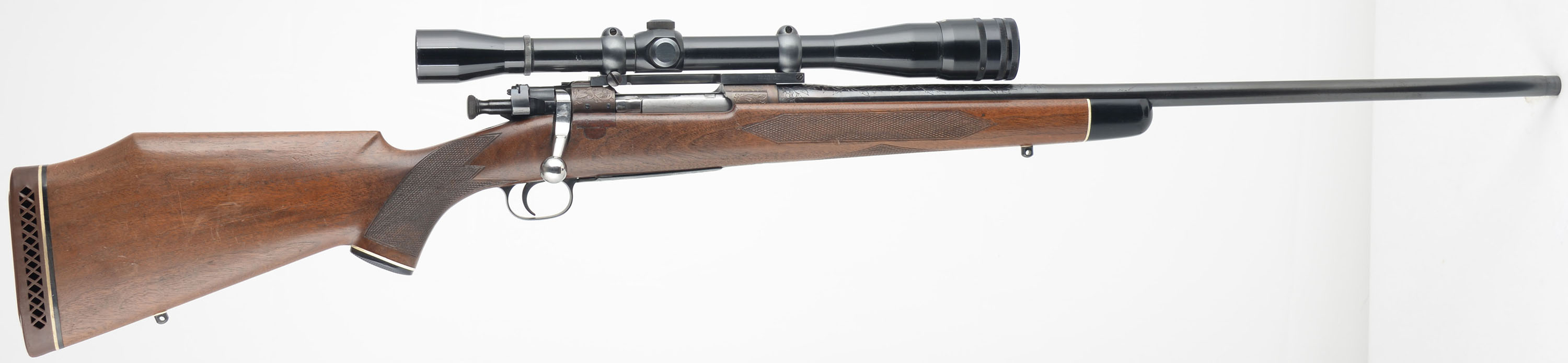 ENGRAVED CUSTOM Remington, Model 1903 Action, CAL: 30-06, MFG: 1942, SN: 3120239, Bolt Action Rifle, 24'' barrel. The custom cheeked & capped pistol grip Monte Carlo wood stock is excellent. It has an ebony style forend tip. There is an inlay of wood in front of the bolt handle to fill a previous cutout. The wood shows several minor scrapes, scratches & contusions to the finish. The metal displays scroll & foliage hand engraving to the receiver, barrel, floorplate & trigger guard, with the floorplate also featuring a stag head, The receiver has a unique bronze tone finish, while the barrel & other metal components have a traditional blue finish, which is excellent. Bore is excellent. The receiver carries a Lyman Perma Center All-American 20X scope, while the barrel has no open sight provisions. Buttstock carries a Pachmayr White-Line ventilated recoil pad. Sling studs. A nicely built custom bolt action rifle. FFL or C&R Req. - Value: 800 to 1200