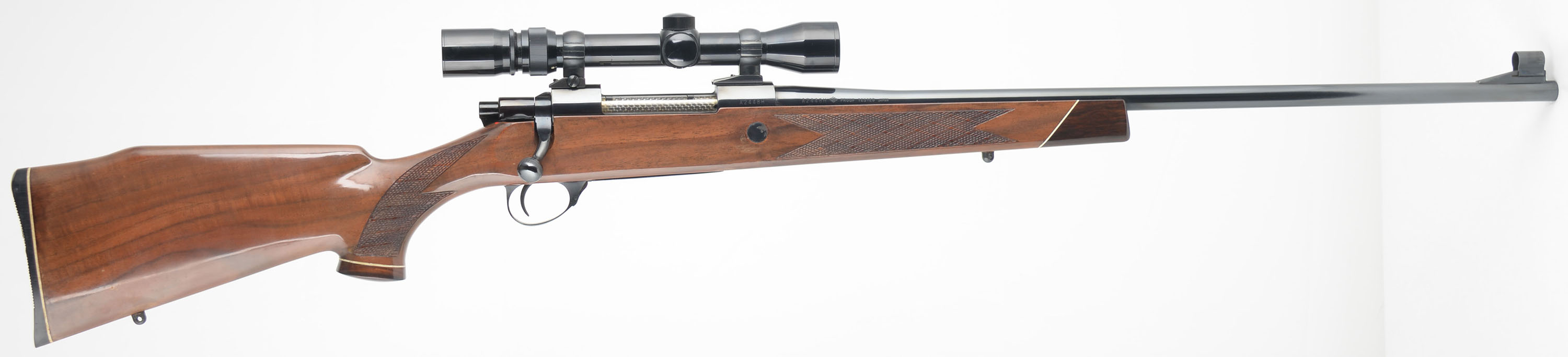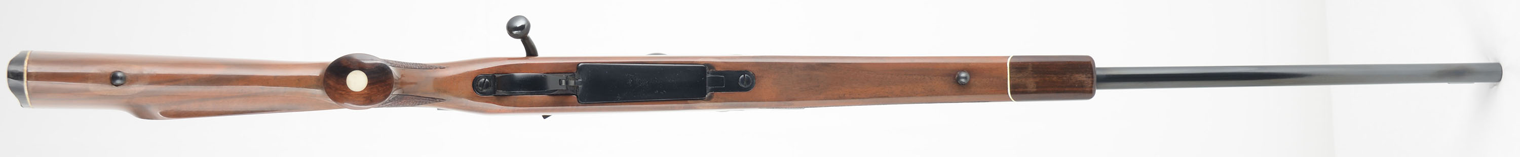 Dickson-Howa, Model Golden Bear, CAL: 30-06 SPRG, MFG: 1967, SN: A2448H, Bolt Action Rifle, 24 1/2'' barrel, Howa of Japan presented the Howa Golden Bear bolt action rifle at the Chicago Shot Show in 1967. Approximately 3000 Golden Bear rifles were exported to U.S.A & passed all the tests at HP White Laboratory, which is one of the worlds most prestigious firearms testing laboratories. After the introduction of the rifle, Howa won the fame & acceptance in the U.S market. As most Sako enthusiast are aware, the ''Golden Bear'' was an almost exact copy of the Sako Finnbear. Conventional wisdom is that Sako sued Howa for patent infringements, which stopped the production & sale of the Golden Bear. The original skip line checkered, cheeked & capped pistol grip Monte Carlo walnut stock is excellent, with rose wood slant-cut forend tip & pistol grip cap. The original finish is very good, but has started to haze some & has a couple of areas of discoloration. There are a few light scratches & contusions to wood & finish. The original metal blue finish rates 98% overall. Bore is excellent. The receiver carries a Bushnell Sportview scope, while the barrel has a hooded ramp front sight. Stock carries the factory buttplate. Sling studs. A very nice, high quality & fairly rare hunting rifle. FFL or C&R Req. - Value: 400 to 800