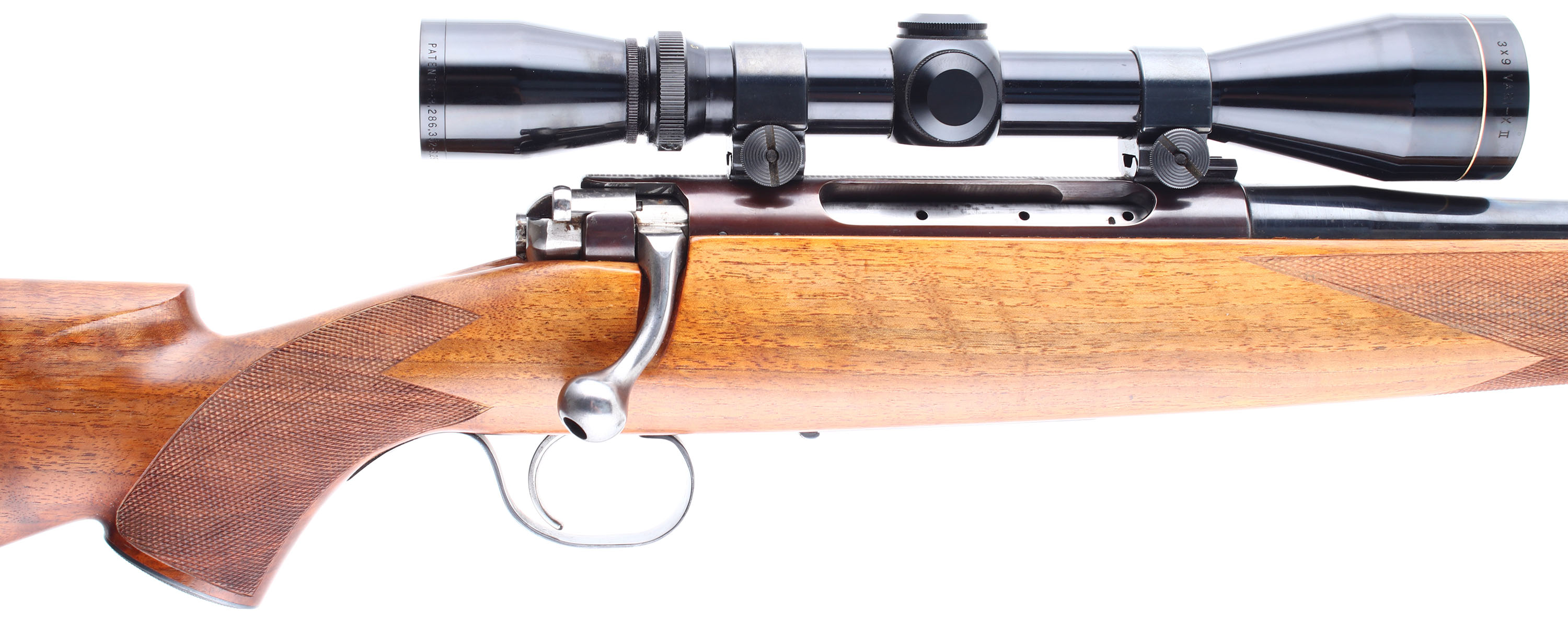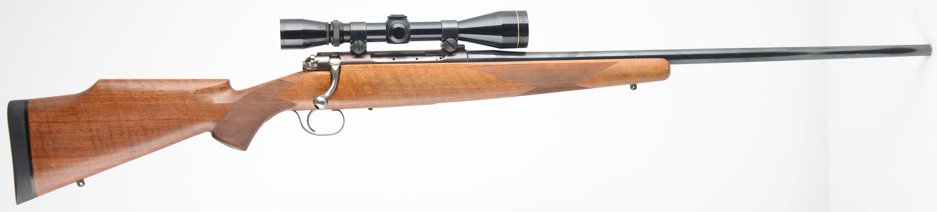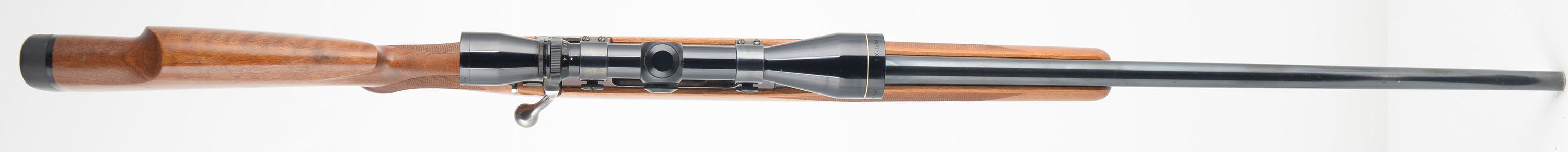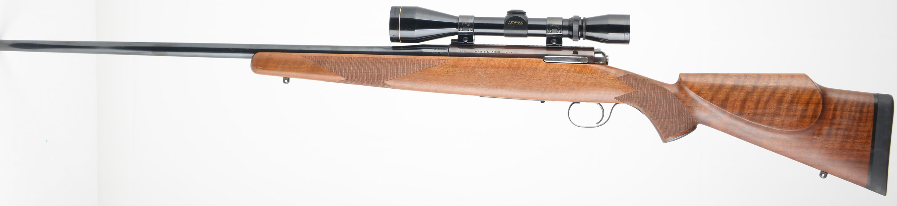 Schultz & Larsen, Model M54J, marked Cal. 7mm Rem Mag, MFG. 1954-57, Otterup Denmark, SN: 2276, Bolt Action Rifle, 25'' Round barrel, The original factory cheeked Monte Carlo wood stock is excellent. The stock features hand cut checkering & a checkered metal pistol grip cap. There are a few minor handling marks or rubs to the excellent original finish. The original metal blue finish rates 90% overall, with the receiver toning a unique burgundy tone. The receiver is fitted with a Leupold Gold Ring Var-X II 3-9 scope, with covers, while the barrel has no provision for open sights. Bore is excellent, Stock carries a Pachmayr Old English solid recoil pad. Factory sling studs. These high quality limited production rifles are desirable amongst hunters & collectors. FFL or C&R Req. - Value: 400 to 800