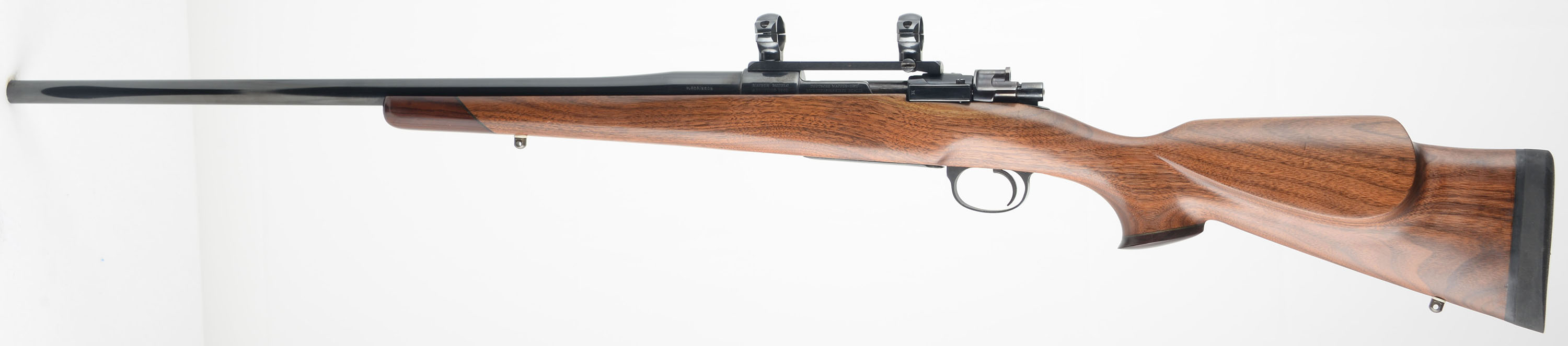 Custom DWM, Model: 1909 Argentino Mauser Action, Cal: 240 Weatherby, MFG: 1910 German, S/N: B3773, Bolt action Rifle, 22 1/2'' barrel. The custom cheeked & flat pistol grip Monte Carlo stock is excellent, with the rosewood slant cut forend tip & pistol grip cap. Its features give the custom stock has the appearance of a Weatherby style stock. The deluxe wood displays excellent grain & has very few tiny handling marks to the excellent overall finish. The metal blue finish rates 95% overall, with some cleaned pitting under the blue on the floorplate. The left side of receiver is marked ''MAUSER MODELO ARGENTINO 1909'', ''DEUTSCHE WAFFEN-UND'', ''MUNITIONSFABRIKEN BERLIN'', right side of receiver is marked with S/N, Left side of the barrel is stamped ''M. Robinson''. Bore is excellent & bright. The receiver carries a set of rings on a Redfield bar mount, while the custom barrel carries no open sight provisions. The stock carries a Decelerator solid rubber recoil pad. Excellent overall & nicely built. FFL or C&R Req. - Value: 400 to 800