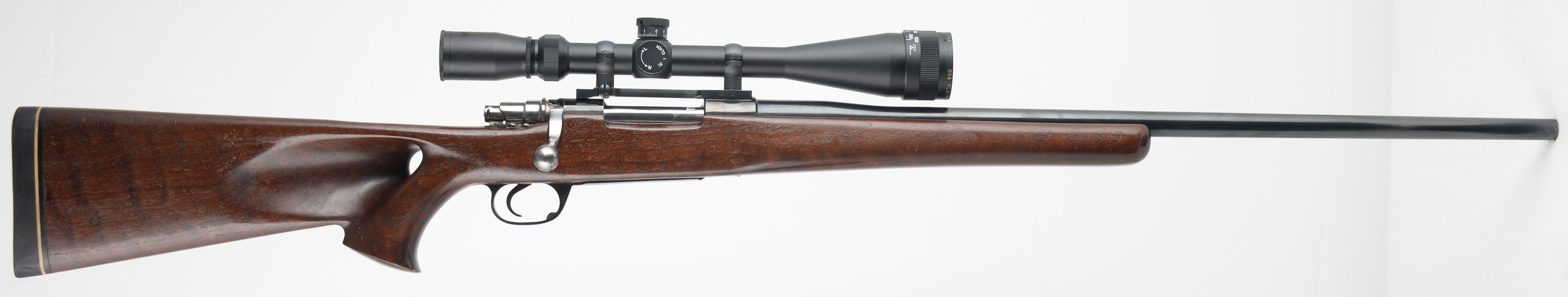 Custom Commercial Mauser Action, Cal: 6mm Rem, MFG: 1930's-60's, S/N: Z-55319, Bolt action Rifle, 26 1/2'' barrel. The custom & very unique straight-line comb, cheeked & thumbhole pistol grip stock is excellent. There are several minor handling marks, scratches & contusions to the excellent overall finish. There is a small chip to the edge of the pistol grip & some scratches at the top of the comb from bolt removal. The metal blue finish on the barrel & receiver rates 90%, 80% on floorplate & trigger guard, with areas on the receiver toning plum. Bore is excellent & bright. The receiver carries a BSA Platinum 8-32X44 scope on Leupold mounts, while the custom barrel carries no open sight provisions. The stock carries a solid rubber recoil pad. Sling studs. A solidly built custom Mauser action rifle. FFL or C&R Req. - Value: 300 to 600