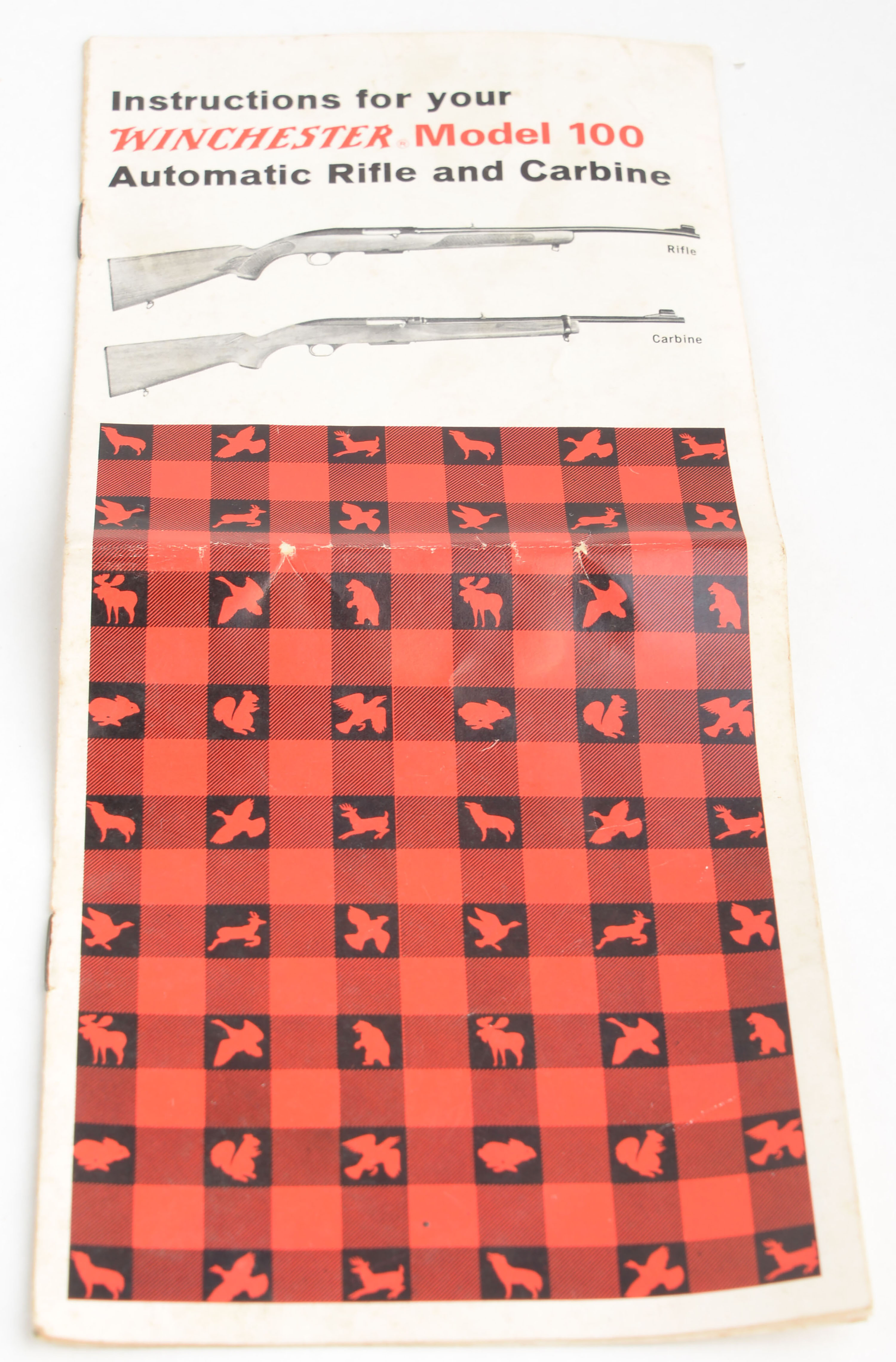 Winchester, Model 100 Carbine, marked Cal. 284 WIN, MFG. 1964-73, SN: 157400, Semi Auto Rifle, 19'' Round barrel. The original metal capped pistol grip stock is excellent, with minor finish level scuffs or scratches to the original finish. The original factory metal blue finish rates 95% overall. Bore is excellent. Factory folding rear & hooded ramp front sights. Top of the receiver has four open factory holes from previous scope mounting. Original checkered black plastic buttplate. Original Winchester marked 4 round detachable mag. Sling swivels. Comes with the original & period correct instruction booklet. An overall excellent semi auto model 100 rifle. FFL or C&R Req. - Value: 400 to 600