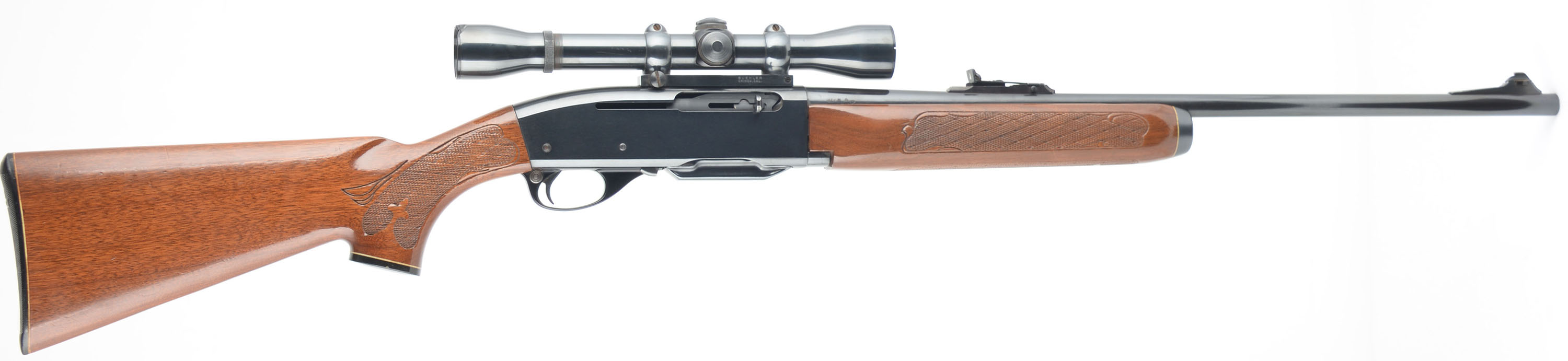 Remington, Model 742 Woodsmaster, CAL: 30-06 SPRG, MFG: 1971, SN: 7128667, Semi Auto Rifle, 22'' barrel. The original checkered & capped pistol grip walnut stocks are excellent. There are a few minor handling marks or light scratches to the excellent original finish. The original metal blue finish rates 97% overall. Bore is excellent. The receiver carries a Weaver K4-C3 scope mounted Buehler mounts, while the barrel holds factory sights. There is a dent in the top of the lip of the back portion of the scope above the lense. Does not affect functionality of scope. The stock caries the factory buttplate.. Detachable mag. Overall excellent & original condition. FFL & C&R Req. - Value: 500 to 1000