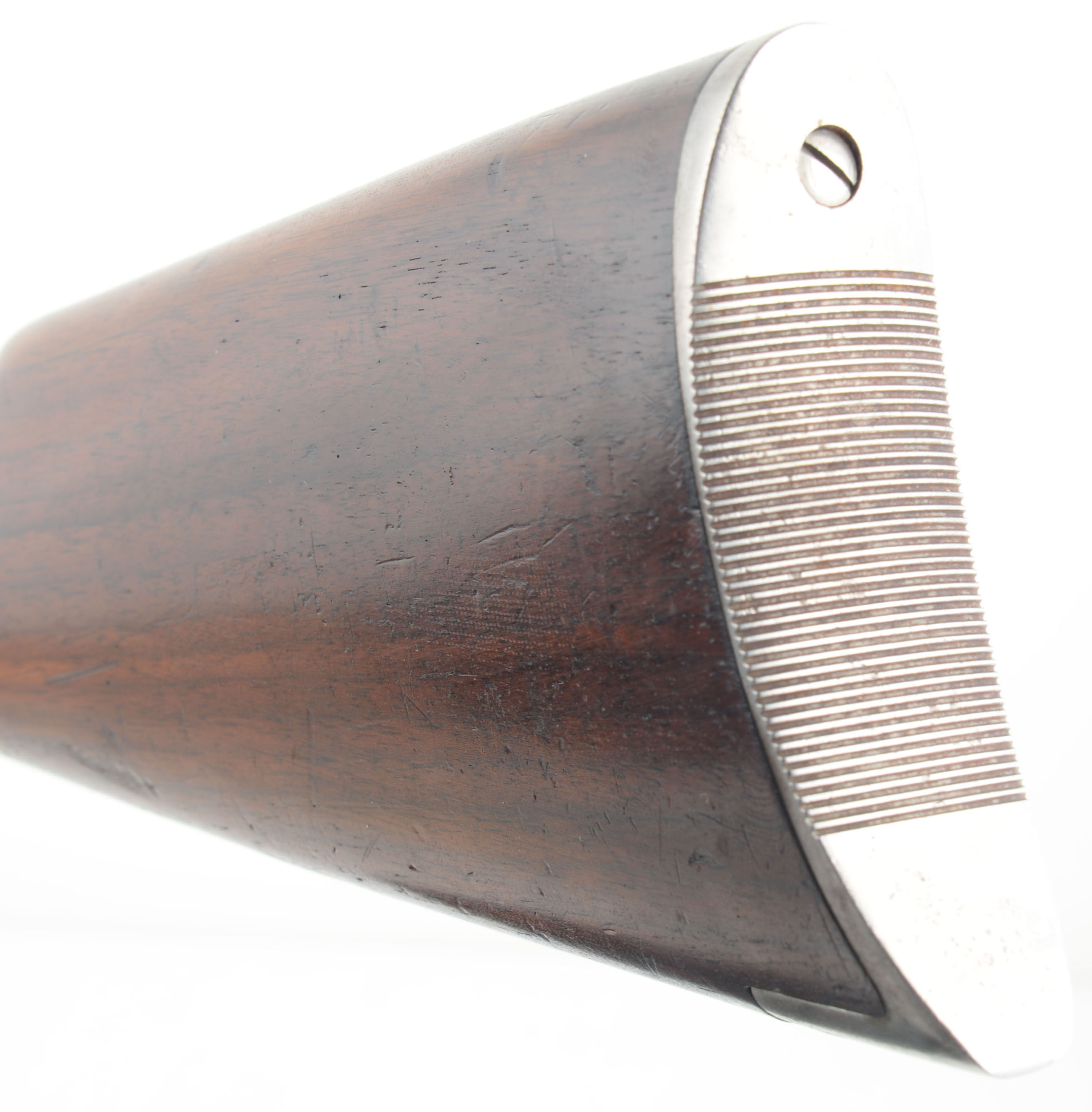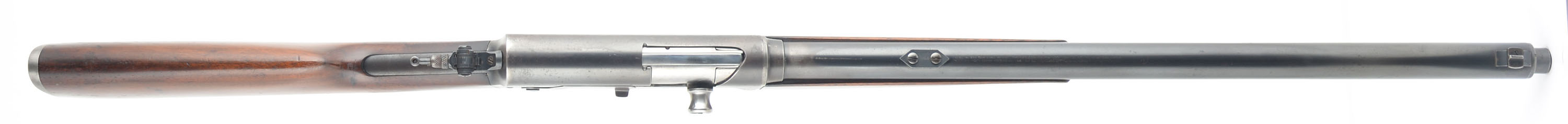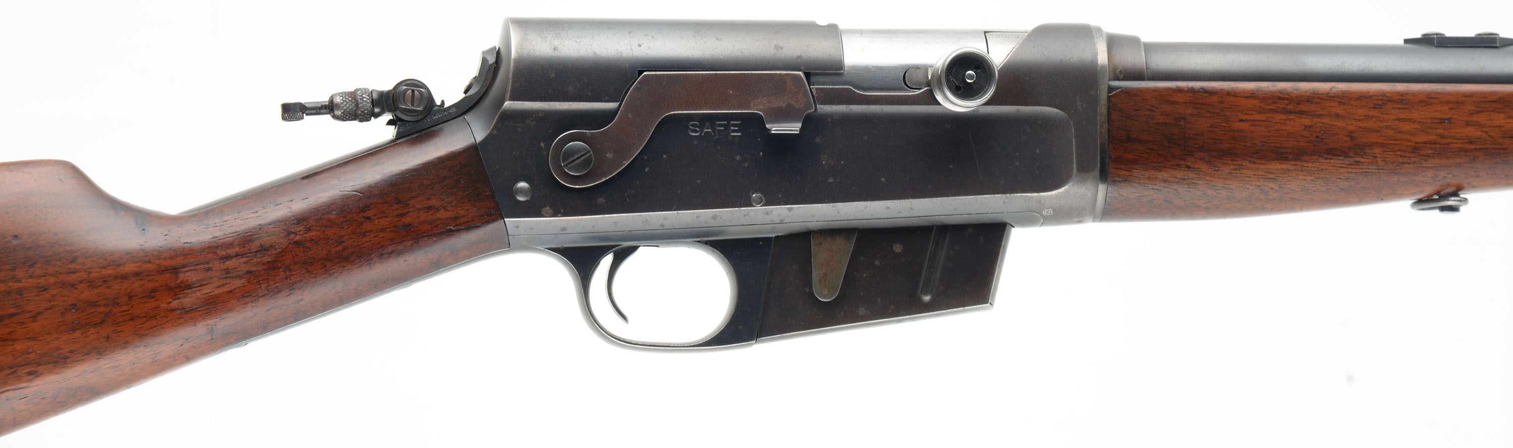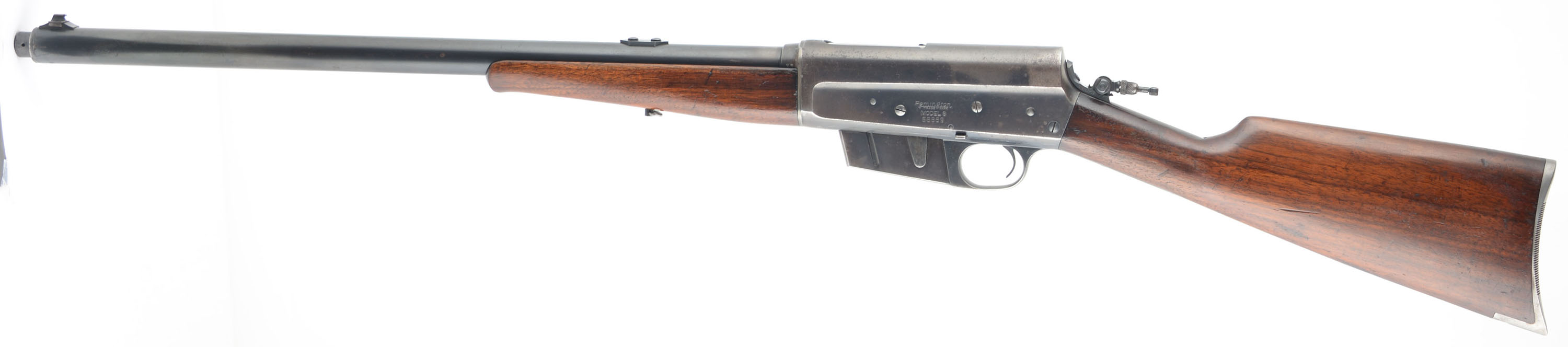 Remington, Model 8, .30 Rem Cal, MFG. 1934, SN: 66869, Semi-Auto Rifle, 22'' barrel. The original straight grip & schnabel forend stocks are excellent & solid. There are several minor to small scrapes, scratches & contusions to the wood & original finish, which has thinned from use & now carries an additional protective layer. The original metal blue finish rates 70% on the receiver, 85% on the barrel, with an area of cleaned pitting on the forward left side of the barrel which is covered with an added blue finish. Bore is very good. The receiver is fitted with a Marbles flip-up tang sight, while the barrel carries a Marble's filler blank in the rear sight provision & a standard blade front sight. Stock carries the popular bottom tang serrated crescent metal buttplate. 5 round fixed magazine. Tight smooth action. A very nice presenting standard rifle. FFL or C&R Req. - Value: 600 to 1000