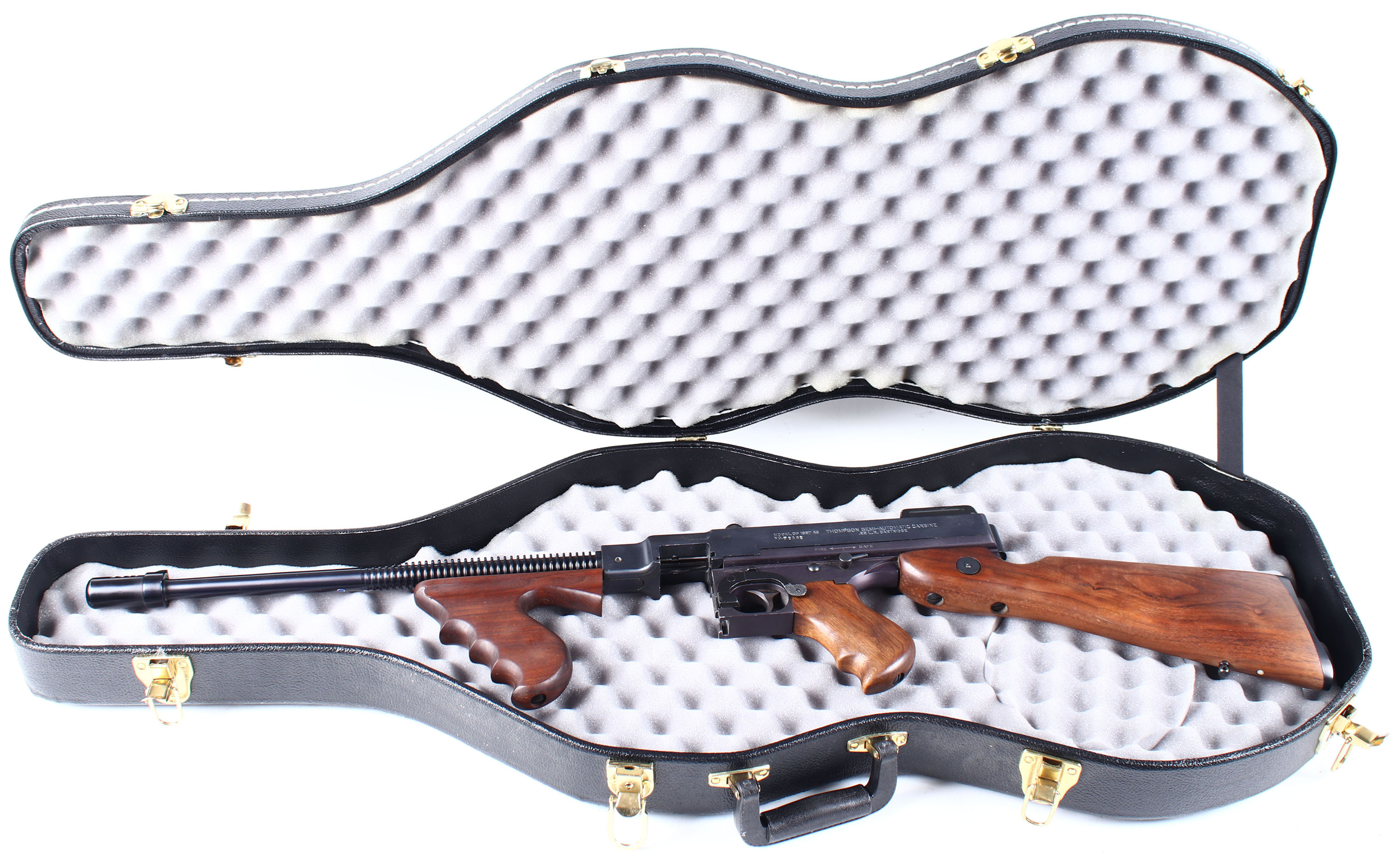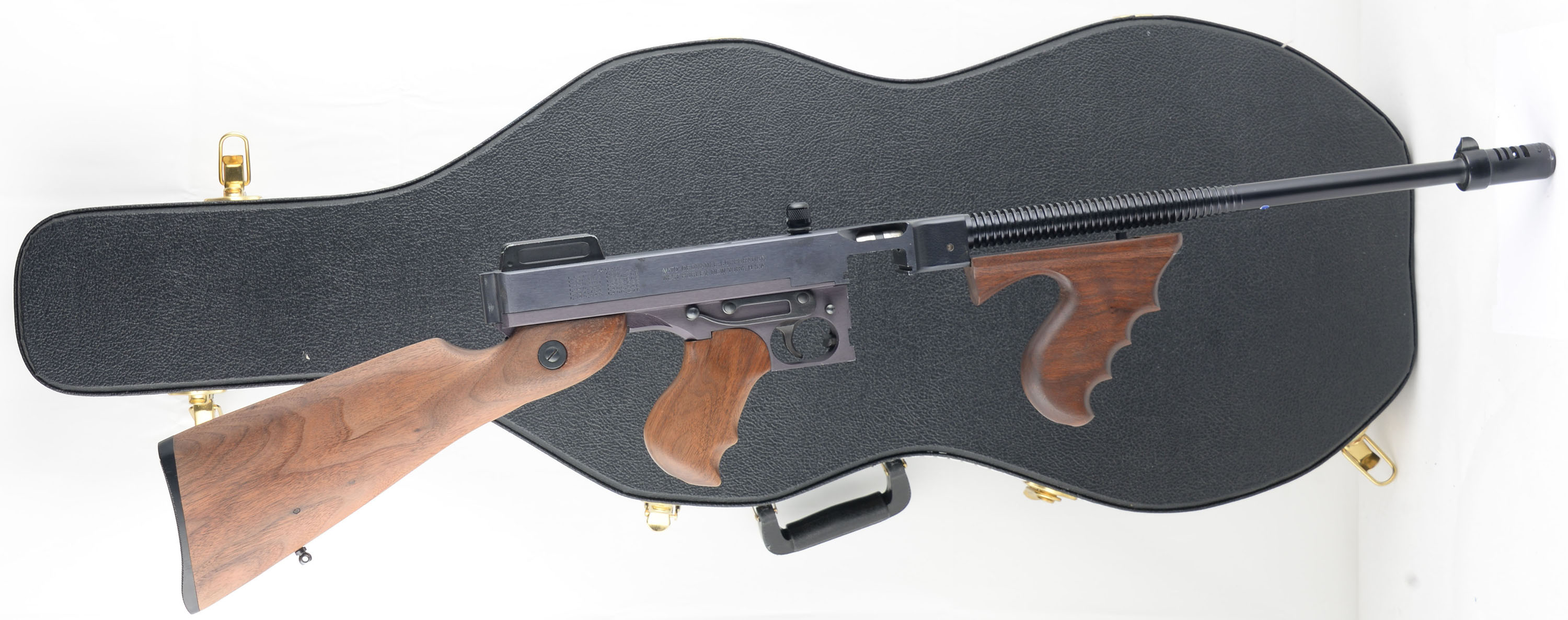 Auto Ordnance, 1927-A3 Thomson Carbine, CAL: 22LR, MFG: 1978-92. SN: T2482, Semi Auto Rifle, 16 1/2'' barrel. The wood grip, stock, and foregrip are in excellent condition, solid with some very minor scraps and dings. The bluing on the upper and lower receivers rates 97% with the upper receiver having some minor patina and small dings exposing gun metal grey. The bluing on the lower receiver has toned to an even plumb patina with concentrated wear in the magazine slot. Bore is excellent, bright and strong. Mechanically solid, seems to function well. The gun has an aperture rear sight screwed into the top of the frame and a blade front sight set in a dovetail cut on the muzzle device. Comes in a gun case shaped like a guitar case. FFL Req. - Value: 1200 to 2000