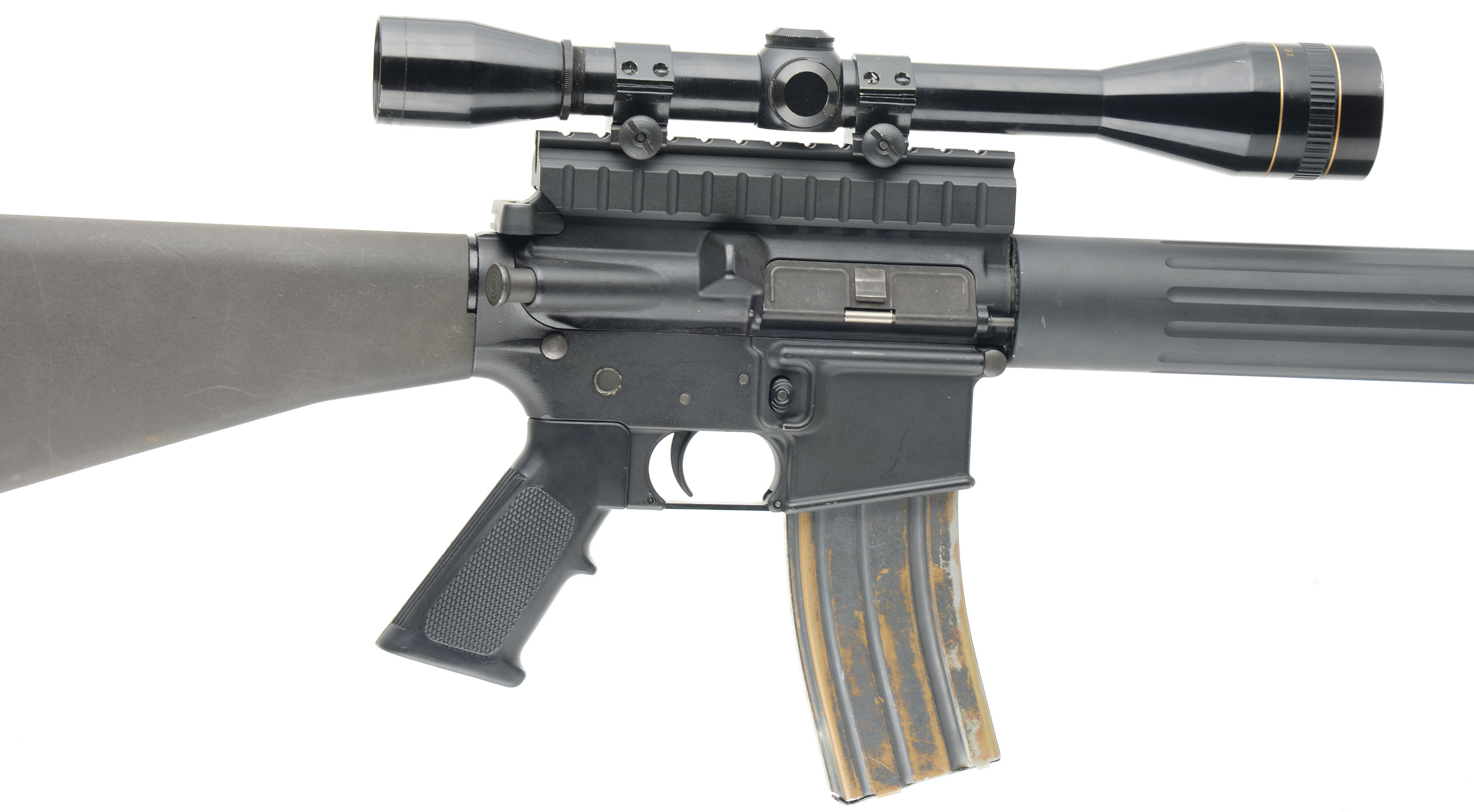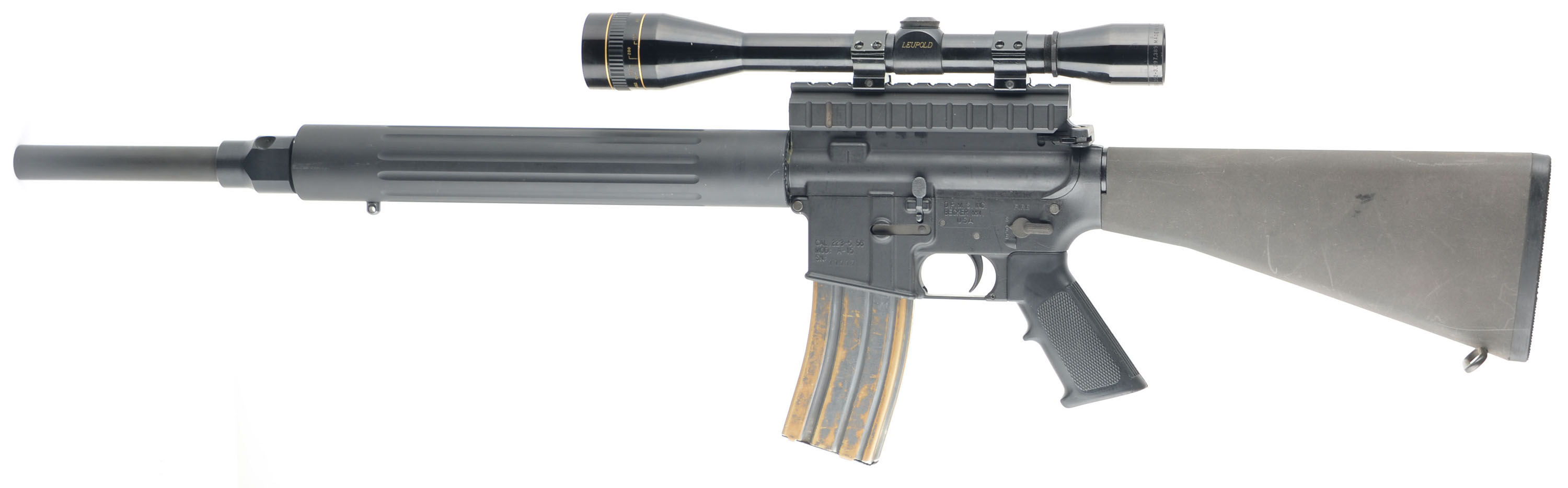 DPMS, A-15, CAL: .223/5.56 (barrel marked .223), MFG: Modern, SN: 11117, Semi Auto Rifle, 20'' barrel. The synthetic checkered grip, composite stock & flued metal forend are all excellent, with handling marks & scuffs. The matte black finish on the upper, lower & barrel rates 95%. The finish on the receiver has a grainy texture & the metal blue finish on the barrel is smooth. Bore is excellent. The rifle is fitted with a Leupold Gold Ring 12x scope. No open sights. Sling loop & stud. Magazine is worn, with brown patina. FFL Req. - Value: 300 to 600