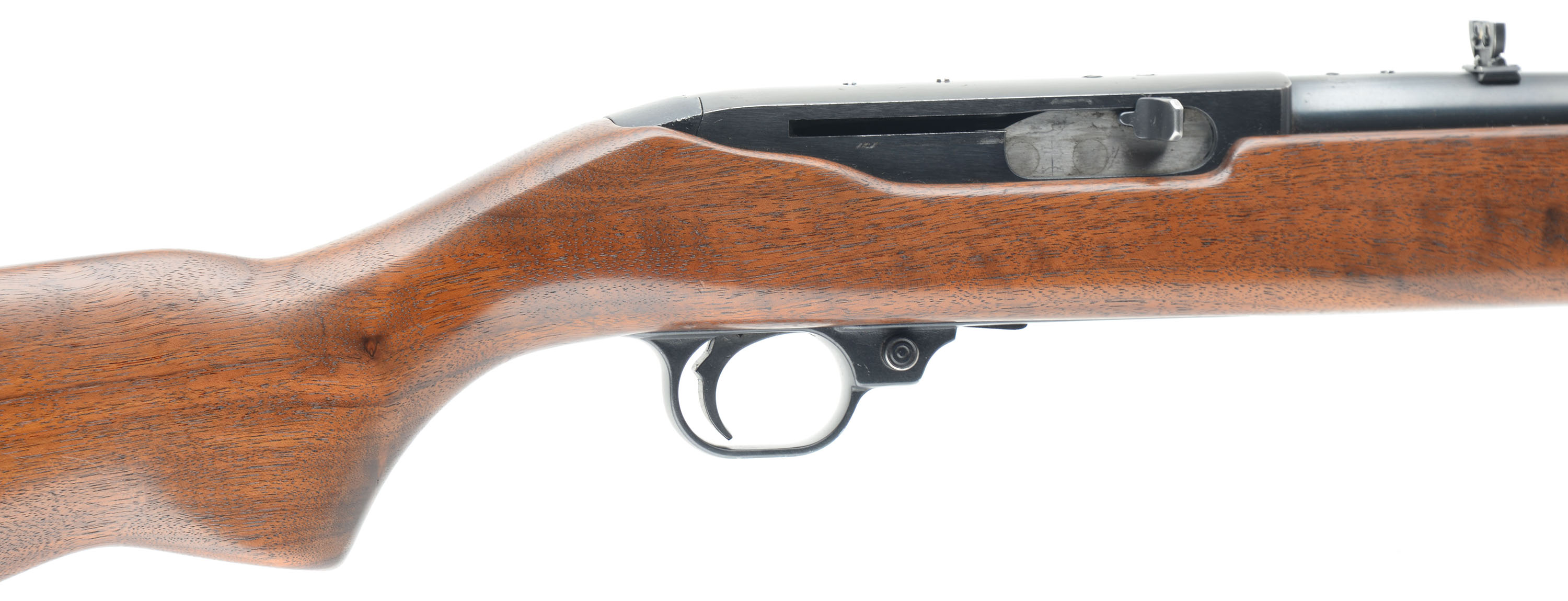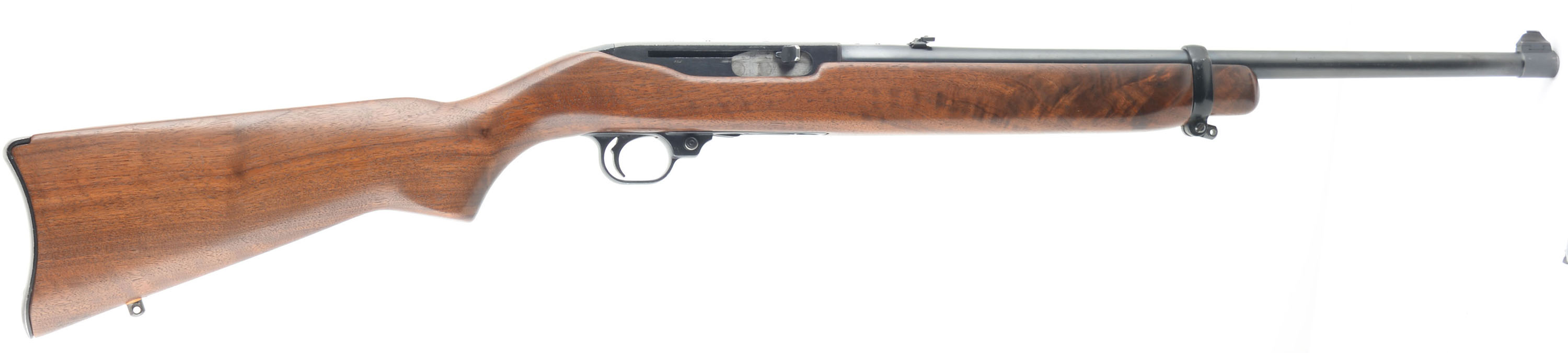 Ruger, Model 44 Carbine, CAL: 44 MAG, MFG: 1966. SN: 107009, Semi Auto Rifle, 18 1/2'' Barrel. The factory wood stock is in excellent condition, solid with light handling wear, scratches, and dings. The blued finish on the barrel and frame rates 97% with some splotches of patina and exposed gun metal grey. Bore is excellent, the rifling is bright and strong. Mechanically solid, seems to function well. The gun has a rear flip up sight and front post sight that are set in dovetail cuts on the barrel. FFL Req. - Value: 700 to 1400