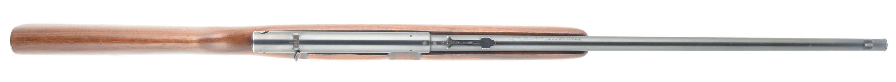 Winchester, Model 74, Marked .22 LONG RIFLE, MFG. 1952, SN: 303802A, Semi-Auto Rifle, 22'' Tapered round barrel, The original American straight grain walnut & pistol grip stock is excellent. The stock has several minor scrapes & contusions to the original finish, which shows some thinning to the forend. The original metal blue finish rates 90% overall. Bore is excellent. Fitted with an adjustable rear sight & small blade front sight. The unusual receiver mounted safety functions by sliding it side to side within a dovetail channel. FFL or C&R Req - Value: 300 to 500