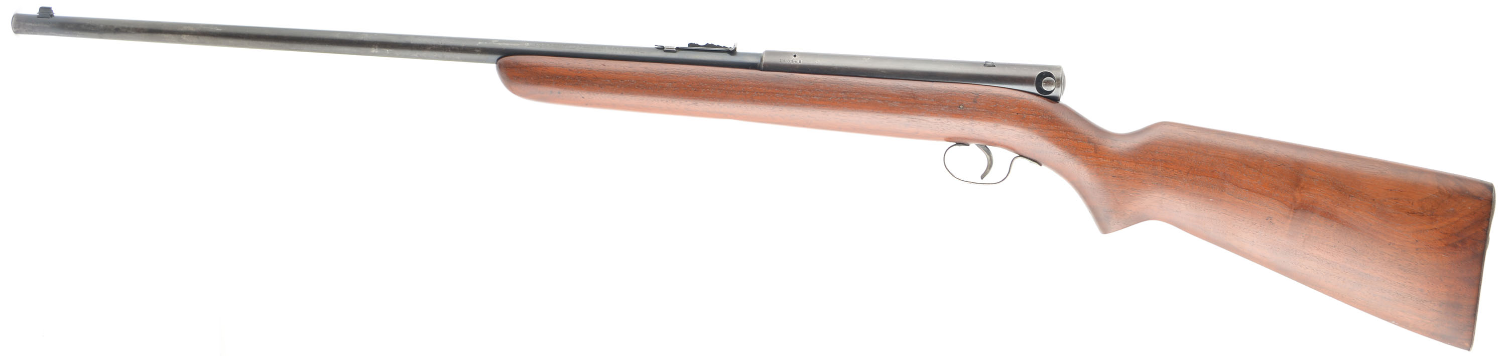 Winchester, Model 74, Marked .22 SHORT, MFG. 1946, SN: 143868, Semi-Auto Rifle, 22'' Tapered round barrel, The original American straight grain walnut & pistol grip stock is very good & solid. The stock has several minor scrapes & contusions to the original finish, with an added thin layer of finish. The is a 1'' tightly repaired crack at the forend tip. The original metal blue finish rates 60% on the barrel, while the receiver has 40% coverage of finish toning to a brown patina. Bore is excellent. Fitted with an adjustable rear sight & small blade front sight. The unusual receiver mounted safety functions by sliding it side to side within a dovetail channel. FFL or C&R Req - Value: 200 to 400